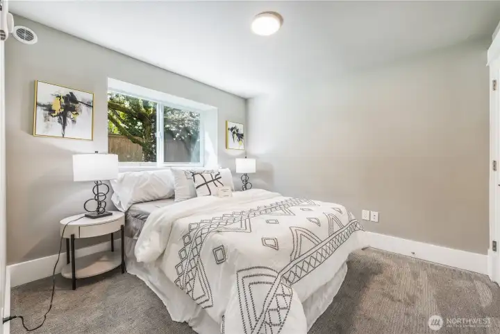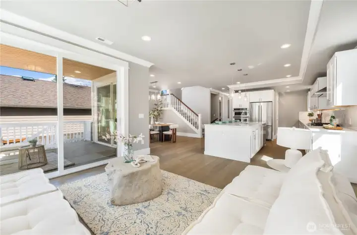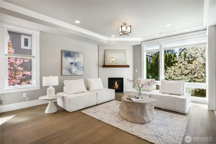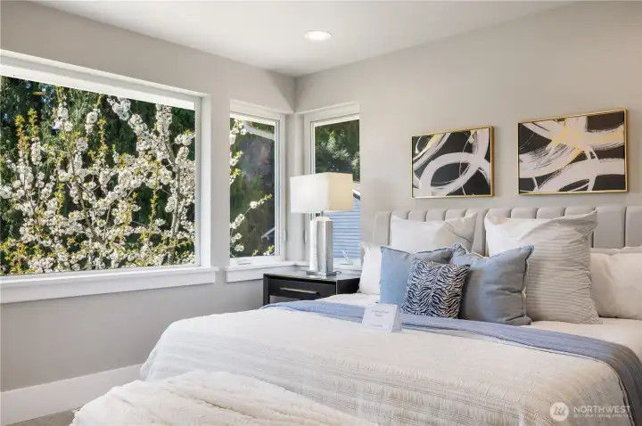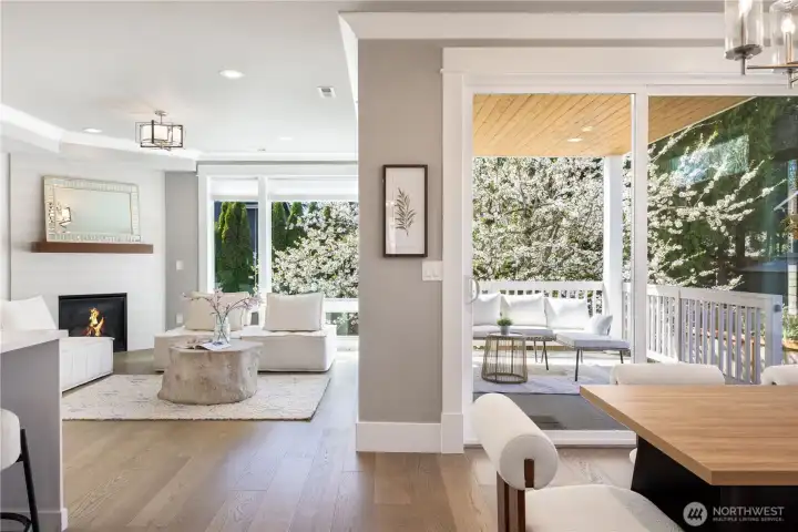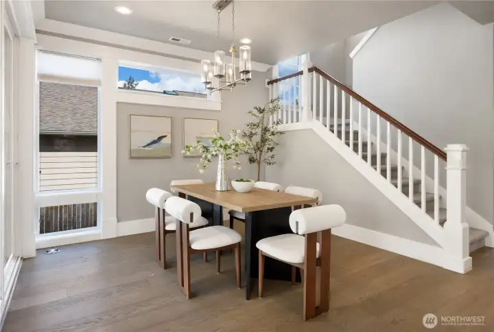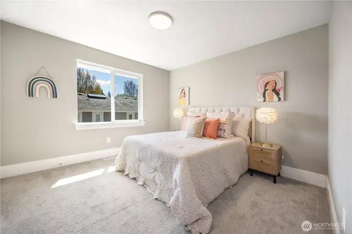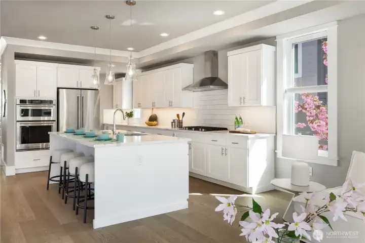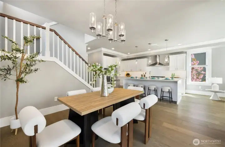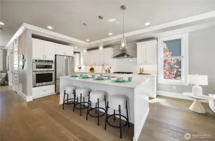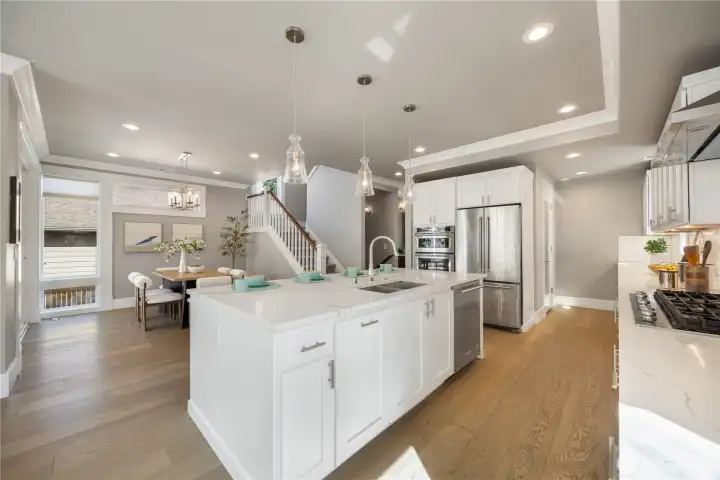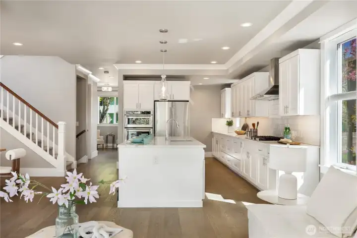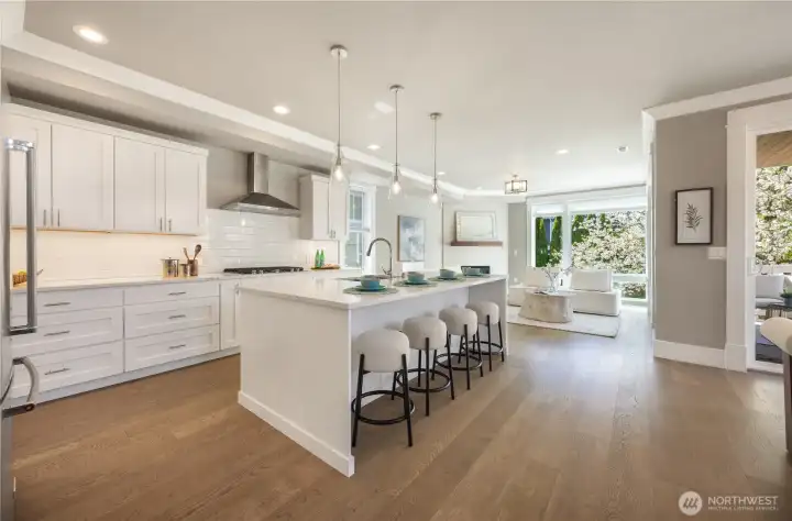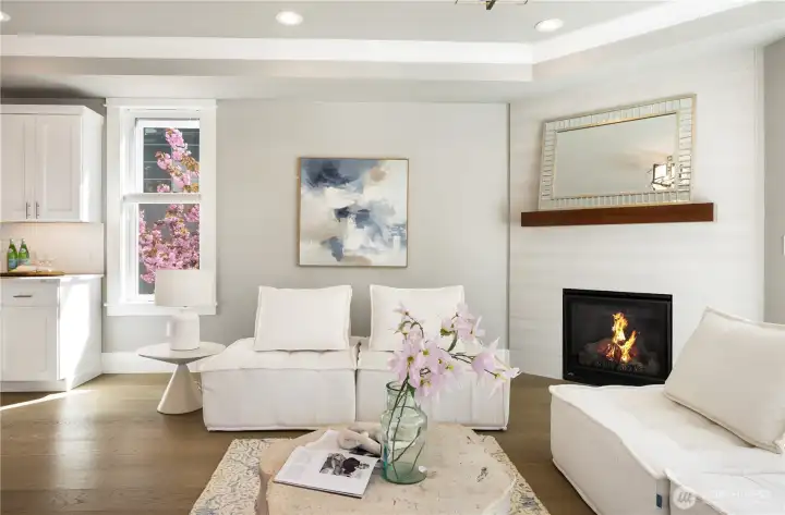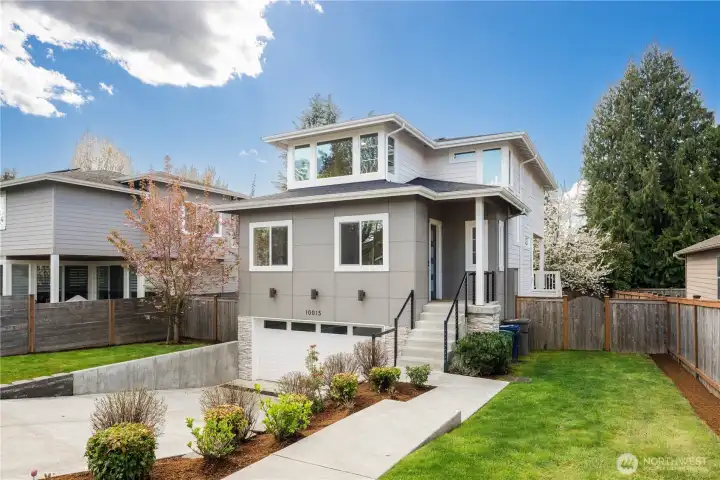 Better than new! Rare opportunity to own a recently built single-family home in the highly sought-after Rose Hill neighborhood at this price point. High quality meets refined taste, showcasing designer-grade modern finishes throughout. Engineered hardwood floors span the main level. The dream white kitchen features slab quartz countertops, full-height tile backsplash, maple cabinetry, under-cabinet lighting, and stylish fixtures. A grand island with eat-in and walk-in pantry provide both beauty and functionality, complemented by a full suite of KitchenAid appliances. The inviting living room with a cozy fireplace flows seamlessly into the dining area and out to a covered patio—perfect for entertaining and enjoying views of seasonal blossoms from every window. A bright main-floor office with an adjacent shower bath offers excellent flexibility. Upstairs, the primary suite offers a spa-like retreat with a walk-in closet. Two additional bedrooms and a full bath complete the upper level. The lower level includes a spacious bonus room, plus an additional bedroom with a shower bath: ideal for guests or multi-generational living. Additional features include A/C, tankless water heater, and a generous fully fenced yard with mature landscaping and year-round blossoms. Prime location just minutes to downtown Kirkland, Tech site, Costco, I-405. Top-rated Lake Washington schools. Don’t miss this opportunity to embrace the warmth and joy Kirkland has to offer!