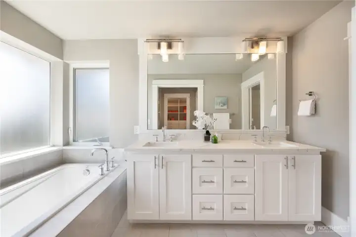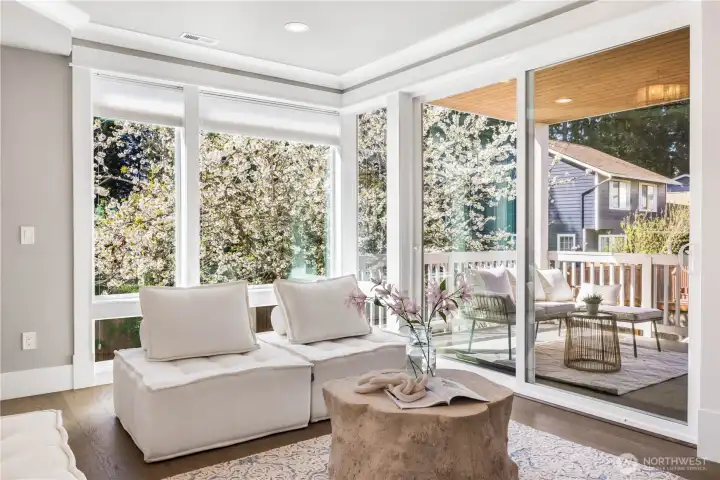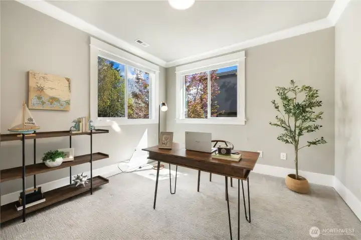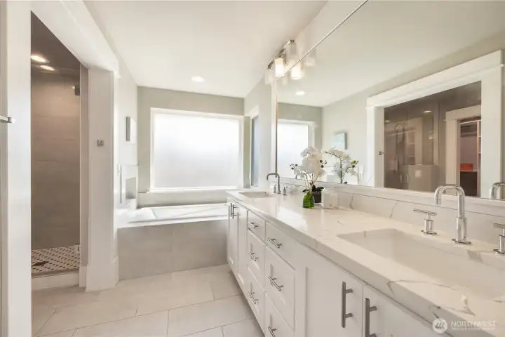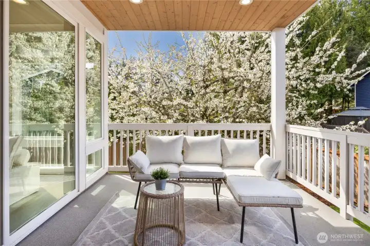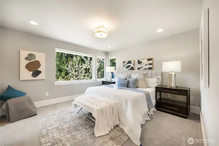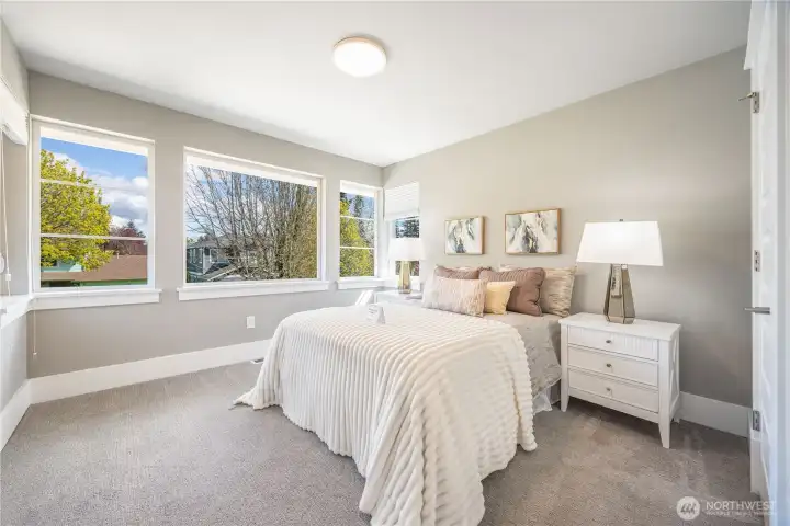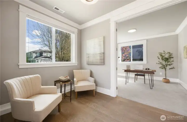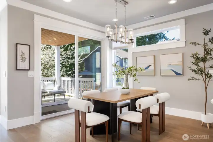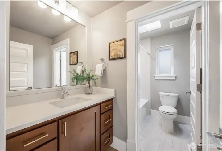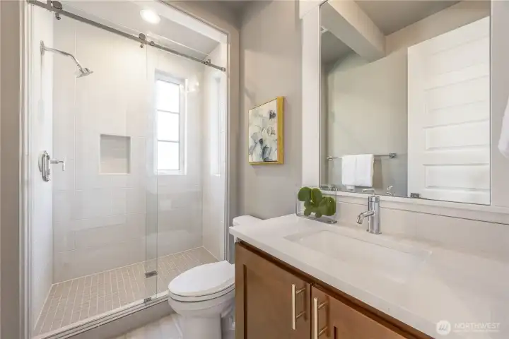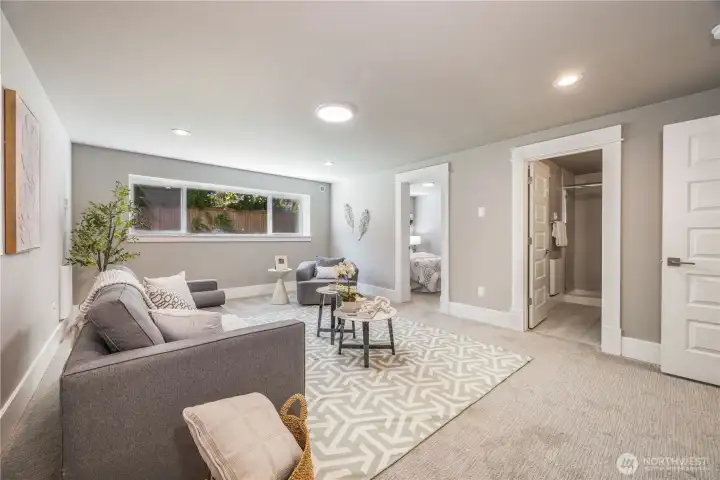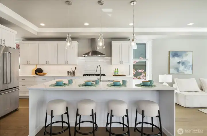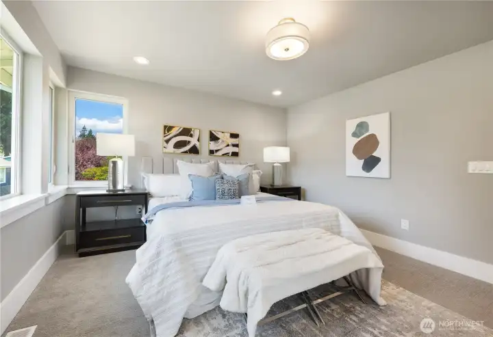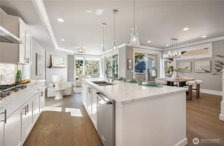 Better than new! Rare opportunity to own a recently built single-family home in the highly sought-after Rose Hill neighborhood at this price point. High quality meets refined taste, showcasing designer-grade modern finishes throughout. Engineered hardwood floors span the main level. The dream white kitchen features slab quartz countertops, full-height tile backsplash, maple cabinetry, under-cabinet lighting, and stylish fixtures. A grand island with eat-in and walk-in pantry provide both beauty and functionality, complemented by a full suite of KitchenAid appliances. The inviting living room with a cozy fireplace flows seamlessly into the dining area and out to a covered patio—perfect for entertaining and enjoying views of seasonal blossoms from every window. A bright main-floor office with an adjacent shower bath offers excellent flexibility. Upstairs, the primary suite offers a spa-like retreat with a walk-in closet. Two additional bedrooms and a full bath complete the upper level. The lower level includes a spacious bonus room, plus an additional bedroom with a shower bath: ideal for guests or multi-generational living. Additional features include A/C, tankless water heater, and a generous fully fenced yard with mature landscaping and year-round blossoms. Prime location just minutes to downtown Kirkland, Tech site, Costco, I-405. Top-rated Lake Washington schools. Don’t miss this opportunity to embrace the warmth and joy Kirkland has to offer!