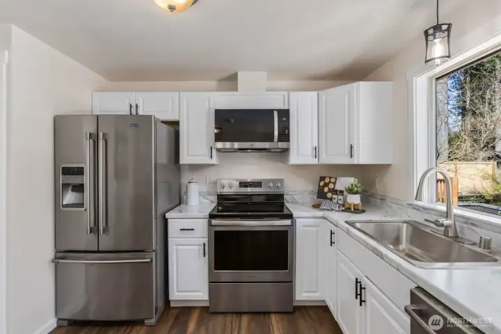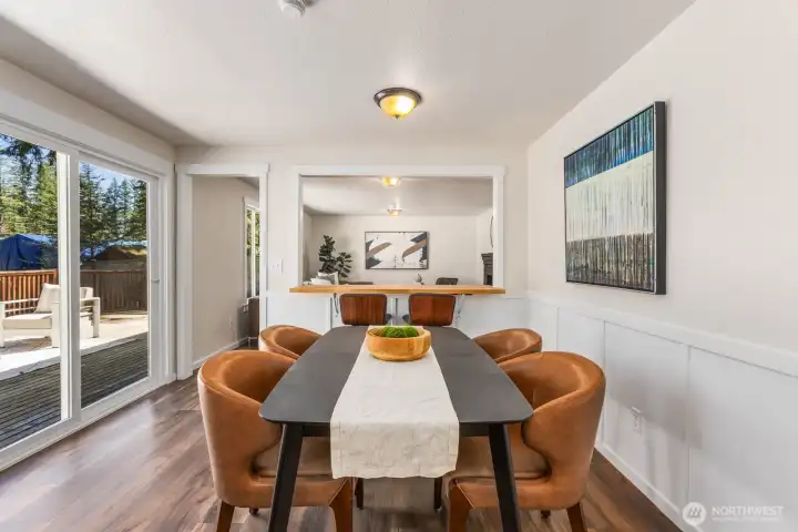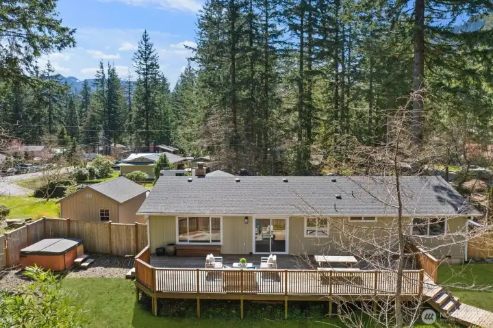 Tucked into a quiet cul-de-sac in the welcoming community of Wilderness Rim, this fully renovated rambler offers an ideal blend of comfort and Northwest living. Nearly every surface has been updated, featuring a beautifully remodeled kitchen with new cabinetry, countertops, and appliances, along with an updated bathroom, fresh interior paint, new doors, trim, casings, millwork, and modern fixtures throughout. Real wood finishes add a sense of quality, while the clean, cohesive design ties it all together. Natural light fills the inviting living spaces, anchored by a cozy gas fireplace with an updated brick surround. Step outside to a ~700sqft deck, perfect for entertaining or relaxing, complete with gas BBQ hookup and a private hot tub. The fully fenced yard also features an in-ground olympic-size trampoline, while a ~200sqft powered shed offers excellent flexibility as a workshop, studio, or storage. A large driveway and two-car garage provide plenty of parking. Enjoy easy access to neighborhood trails and recreation, with Rattlesnake Lake just minutes around the corner, along with quick access to North Bend amenities.
