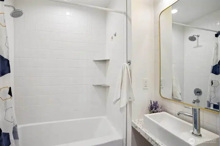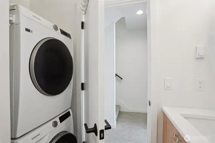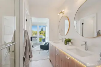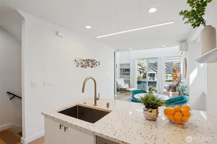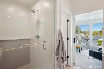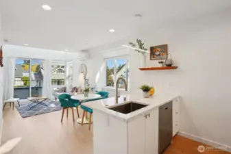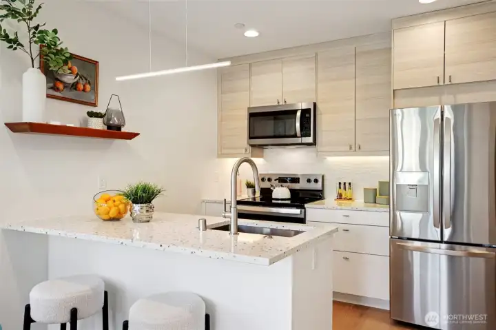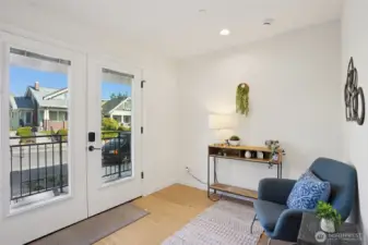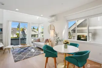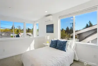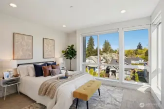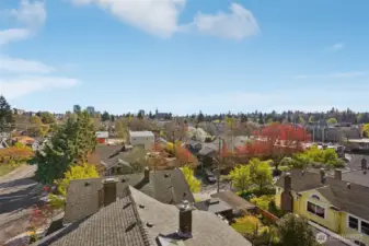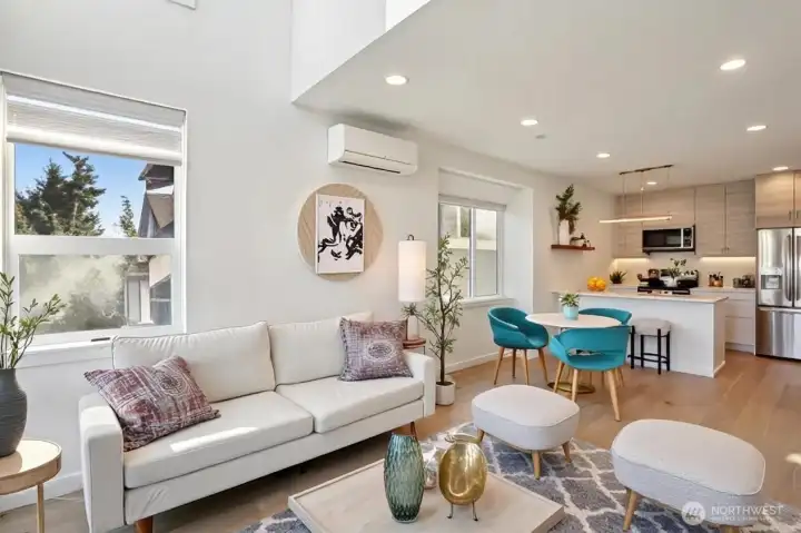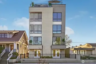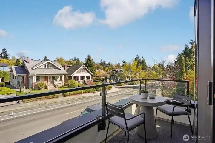 Welcome home to this stunning residence tucked within the tree-lined streets of Ravenna. Thoughtful design and quality craftsmanship shine throughout, from the beautiful hardwood floors to the expansive walls of glass that fill the home with natural light. The entry level features a private office/flex space complete with its own bedroom and full bath—an ideal setup for guests, extended stays, or a quiet workspace. The open living and kitchen areas boast high ceilings, sleek modern appliances, and generous windows, creating an inviting atmosphere perfect for entertaining or unwinding after a long day. Upstairs, a loft-style third bedroom doubles as a rec room, offering versatility for your lifestyle. The spacious primary suite includes a walk-in closet and a spa-like bath designed for relaxation. Step up to the private rooftop deck and enjoy territorial views—your own peaceful retreat in the city. With Whole Foods, neighborhood shops, and the light rail station just two blocks away, convenience is at your doorstep. Nearby parks, University Village, and the University of Washington add to the exceptional location, with easy commuter access in every direction. Washer and dryer included. PLUS dedicated parking AND NO HOA!!