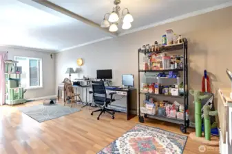 Remodeled condo featuring an open-concept layout connecting the kitchen, dining, and living areas—creating a bright and inviting space. Crown molding and recessed lighting add stylish touches throughout. Upstairs includes a spacious primary bedroom with walk-in closet and direct access to an upgraded bathroom featuring double sink vanities and dual shower heads. In-unit washer and dryer conveniently located upstairs. Updates include beautiful hardwood flooring and vinyl and fresh interior paint, giving the home a clean, modern feel. Ample storage with multiple interior closets plus two outdoor storage areas. Convenient location close to 99, i5 and grocery stores.
