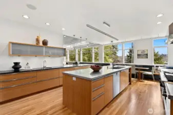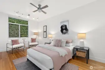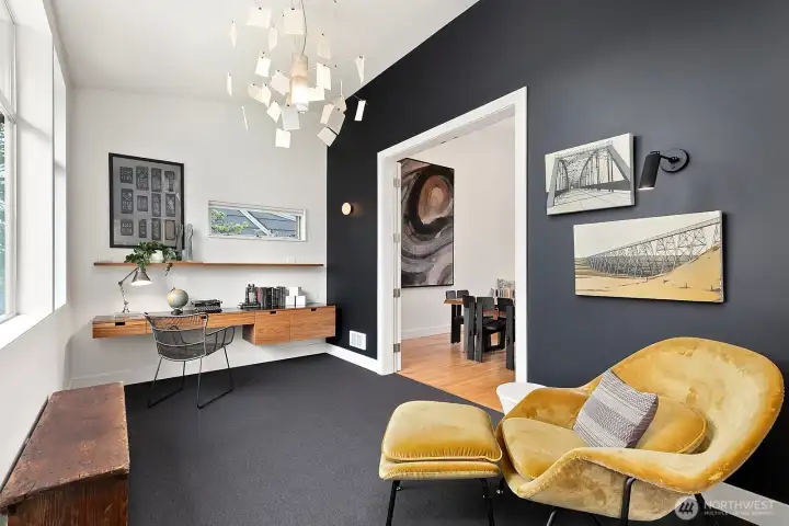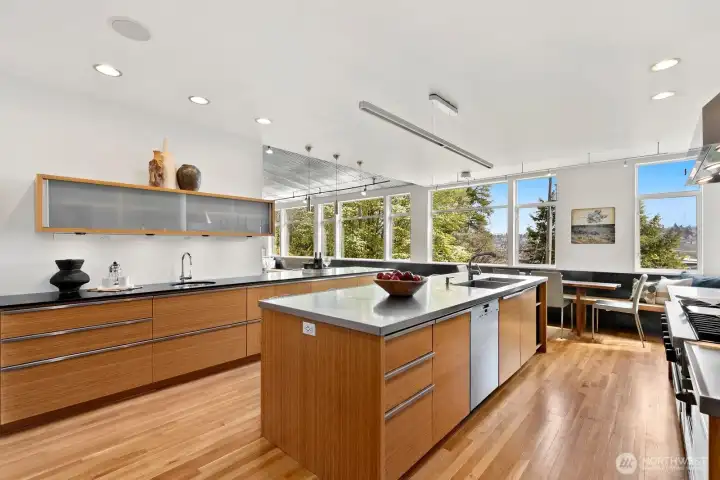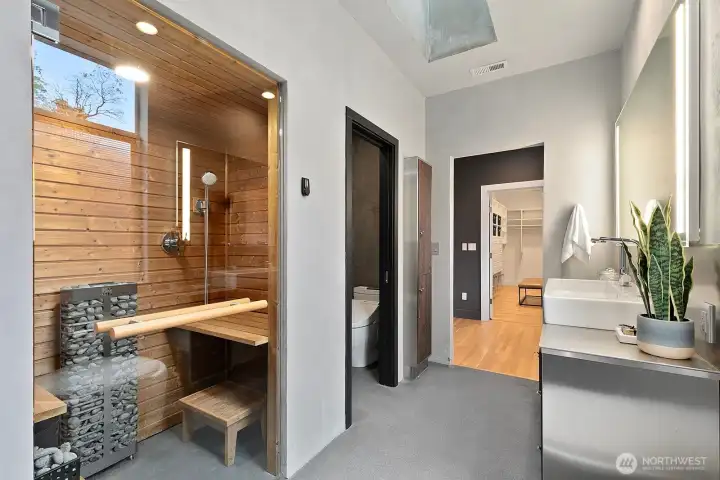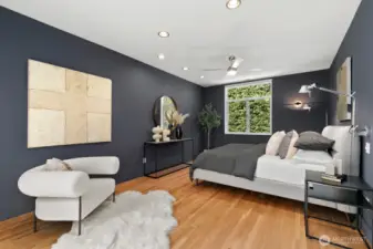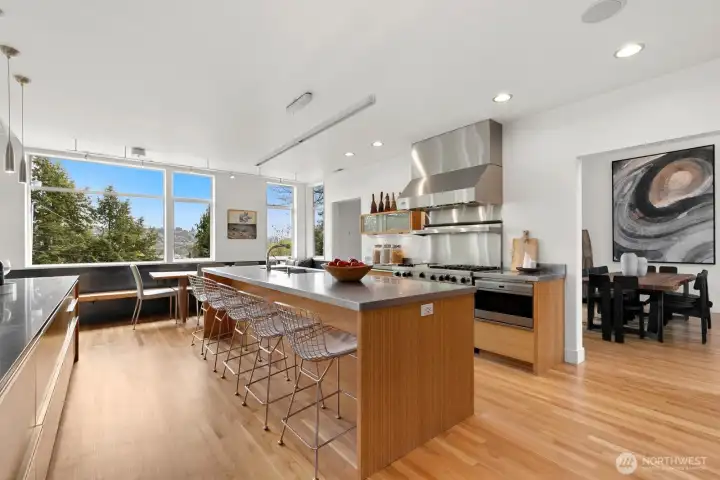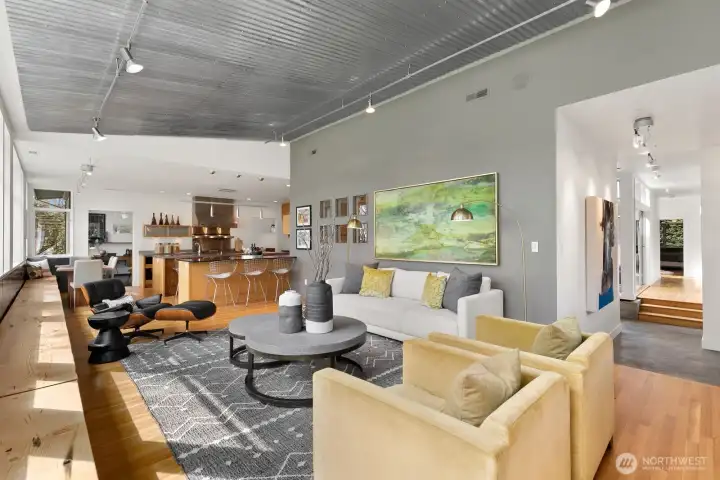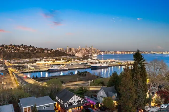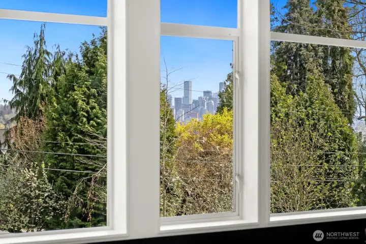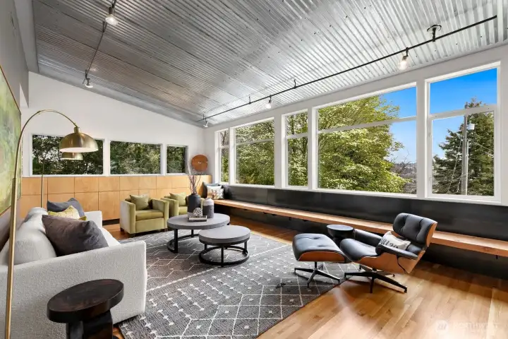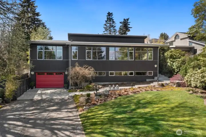 Located in coveted Magnolia, this beautiful modern, fully updated residence offers an exceptional blend of luxury, comfort, and natural privacy positioned in a setting that feels quietly removed, almost like its own private street. Expansive living spaces with soaring ceilings are complemented by softly framed outlooks of the city skyline and Mount Rainier, subtly unveiled through a backdrop of mature trees, creating a rare sense of seclusion while preserving the beauty of the surroundings. Walls of windows fill the home with natural light, highlighting the refinished hardwood floors. The gourmet kitchen is a statement of elegance, featuring premium stainless steel countertop, seamlessly connecting to a spacious dining room and a refined private office just beyond. The main floor hosts a tranquil primary suite complete with a spa inspired ensuite and private sauna, alongside two additional bedrooms joined by a beautifully finished Jack and Jill bath. At the heart of the home, an atrium with a firepit creates an inviting focal point for relaxed evenings. Heated floors extend throughout, enhancing everyday comfort. The lower level offers a versatile rec room with guest suite potential and an additional bath with a walk-in shower. Completing the home is a generous two car garage, ample off street parking, and meticulously landscaped, low maintenance grounds; all with effortless access on and off Magnolia.