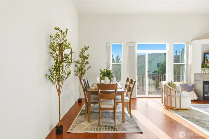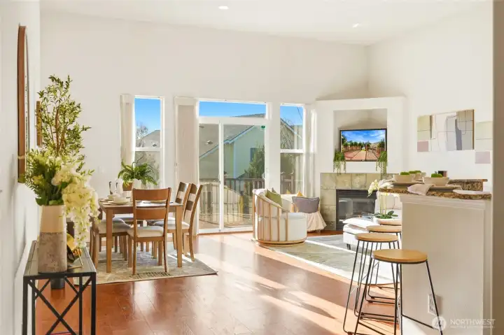 A rare find in Wild Horse at Woods Creek—where trails, parks, and natural beauty are right outside your door. This ONE LEVEL HOME lives like a single-family, attached only at garage, offering privacy with the ease of low-maintenance living. Soaring 12' ceilings and expansive windows fill the home with natural light, creating an open, airy feel throughout. New hardwood flooring runs throughout, and the home also features AC for year-round comfort. The kitchen includes granite counters, stainless appliances, a pantry, and a breakfast bar that opens to the living and dining rooms, complete with a cozy gas fireplace—perfect for everyday living and easy entertaining. A large slider opens to a sunny deck with a remote awning and a private green space—ideal for relaxing or enjoying the outdoors. Enjoy your morning coffee or evening unwind on the covered front porch. The primary suite features an ensuite bath complete with soaking tub & WIC. Two additional bedrooms also include walk-in closets, plus a full guest bath and a spacious two-car garage. Close to amenities: shopping, dining, rivers, parks, and a short drive to Stevens Pass skiing and world-class climbing and rafting in Index—with so much more to explore. Enjoy a simplified lifestyle with exterior and yard maintenance handled by the HOA, all just minutes from downtown and Highway 2 for easy access to everything you need. Immaculately maintained with clear pride of ownership. Pre-inspected, ask your agent for a copy.