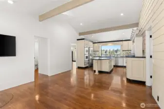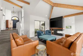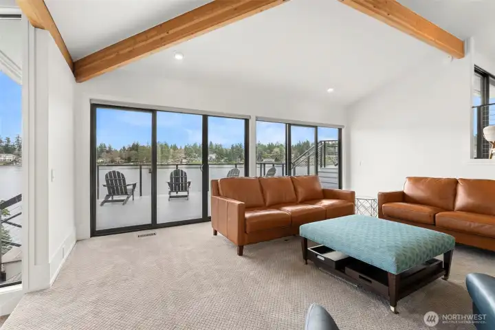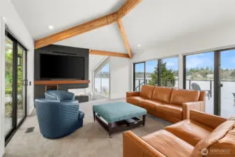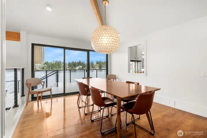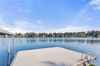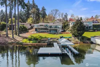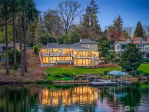 Remodeled home on about 100 feet of historic LAKE STEILACOOM, a rare find on OPEN WATER. This unique and architecturally significant home by Alan Liddle was recently renovated w/ impeccable style and taste. 4 Bedrooms with 2.75 baths. Massive NEW DOCK; about 550 sq feet. Living areas have walls of glass overlooking the lake; Living room w/ gas FP; dining room w/ buffet; kitchen w/ island; nook and large pantry; sitting area. LAKESIDE Primary suite w/spa-like bath; custom tile work; marble; towel warmer and SAUNA. Lower-level rec room w/ new gas fireplace. New stainless steel DOG WASH. MASSIVE large new deck w/ outdoor vinyl for carefree living. Added value comes from new custom millwork, new carpet, new systems like HVAC (AIR CONDITIONING), newer ROOF, and new windows, freshly painted. Over HALF ACRE gives room for extra parking or even a possible sports court! This is a rare blend of location on the lake, updates, and floor plan. A rarity in the market.