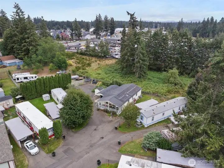 Charming 3-bed, 1.75-bath double-wide in all-ages Twin Firs Park! Tucked on a cul-de-sac near shopping and JBLM. Features laminate flooring, skylights, A/C heat pump, and newer stainless steel appliances that stay. Energy-efficient with paid-off solar panels for low utility costs. Enjoy a large deck, garden space, private shed, covered carport, and backup generator. Lot dues include water, electricity, and septic - easy, low-maintenance living!
