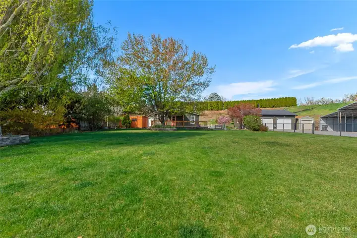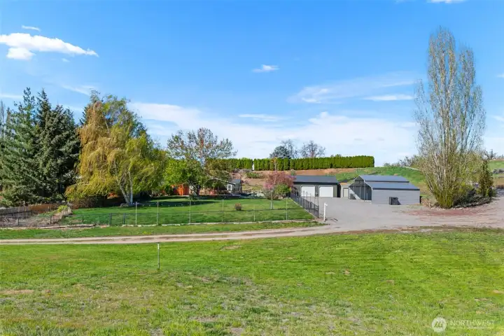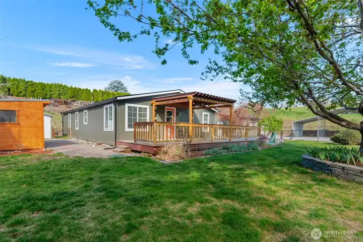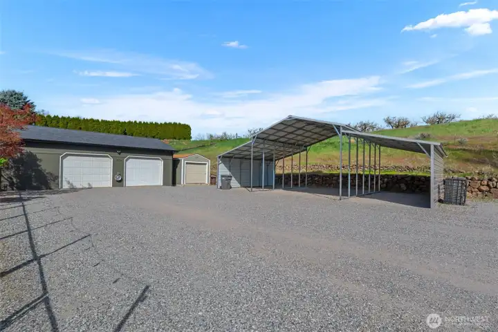 Remodeled Rambler situated on a beautiful, private and flat one care lot! Huge detached 972 sq. ft. garage with pellet stove and built-in workshop. No CCR's or HOA's! Huge 4 car carport, 3 outbuildings, irrigation water, flower beds, deck with pergola and fully fence. New kitchen with stainless steel appliances and block countertops opens to the great room with vaulted ceilings & fan. LVP flooring, vinyl windows and new HVAC and water heater. Split bedrooms for ultimate privacy.