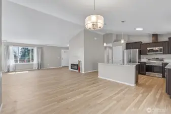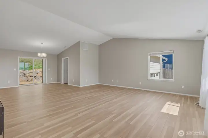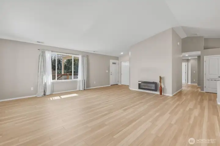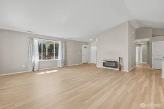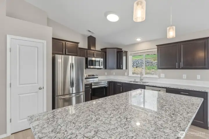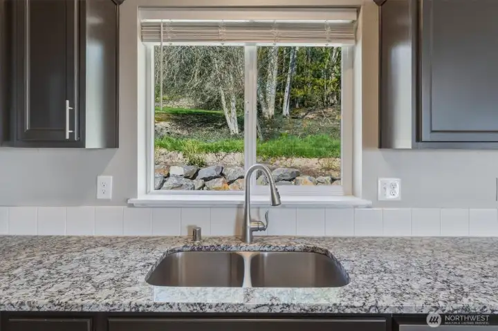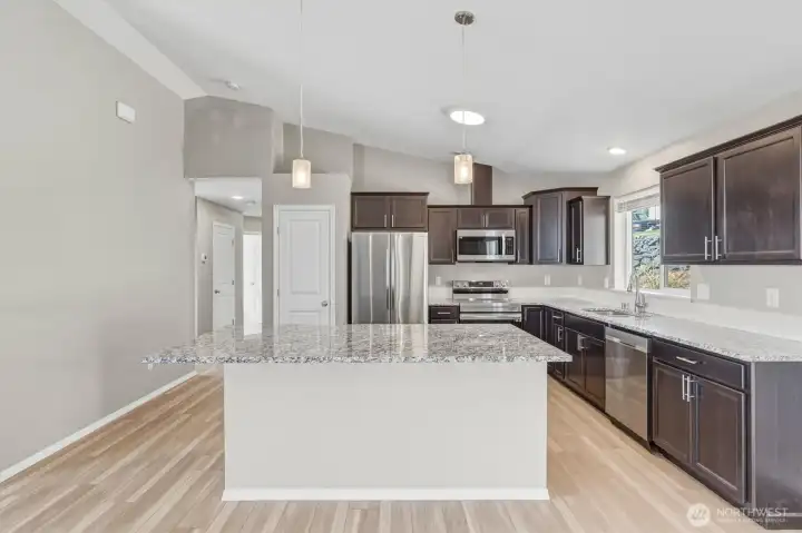 Views to die for from the covered front porch deck, showcasing the Lewis and Clark Bridge, the Columbia River, and the City skyline. Enjoy morning coffee or unwind in the evening with stunning sunsets. This single-level home sits on a corner home site and offers easy entry from the garage. Inside, vaulted ceilings and expansive windows fill the home with natural light and territorial views. The modern kitchen features a large granite island, soft-close cabinets, stainless steel appliances, and luxury vinyl plank flooring throughout. Additional highlights include a forced air heat pump, smart thermostat, and Bluetooth-enabled stove and microwave. The primary bath offers a spacious walk-in shower. Move-in ready with all appliances included. The backside of the home offers added privacy with no homes directly behind. Extensive drainage was added to the home when it was built. Newly planted trees are in place and will continue to mature. A large crawl space provides potential for additional use or storage. PeaceHealth St. John Medical Center is just 10 minutes away, with grocery stores and shopping close by for convenience.