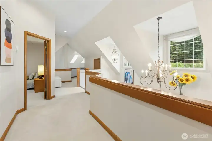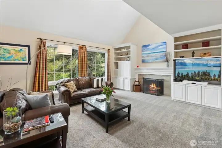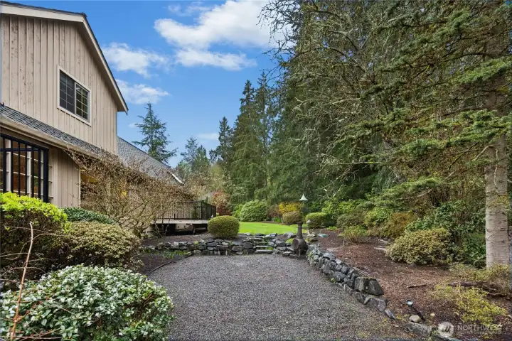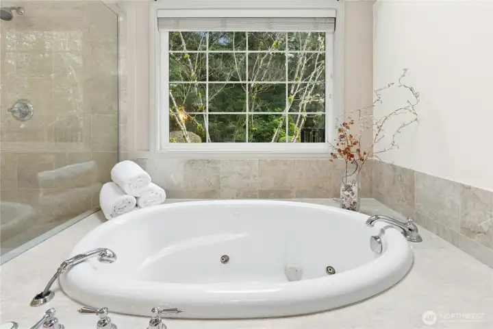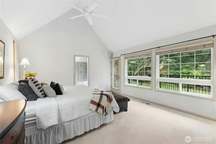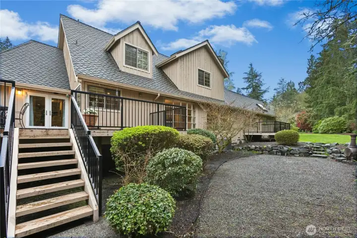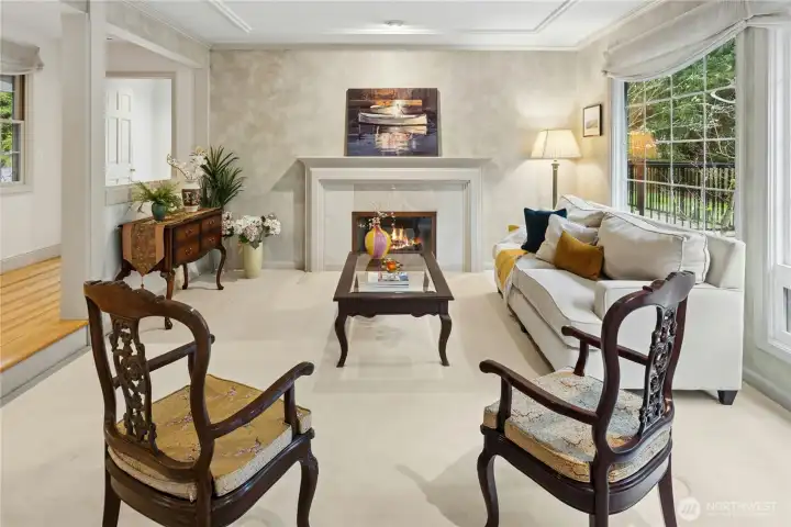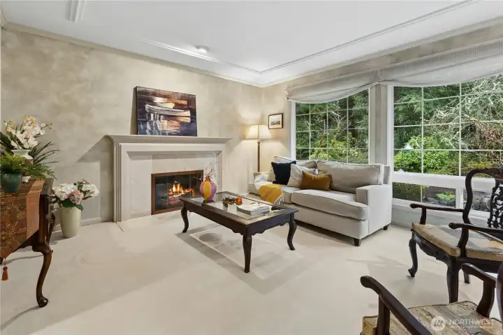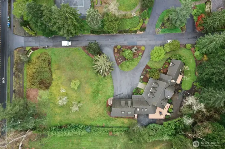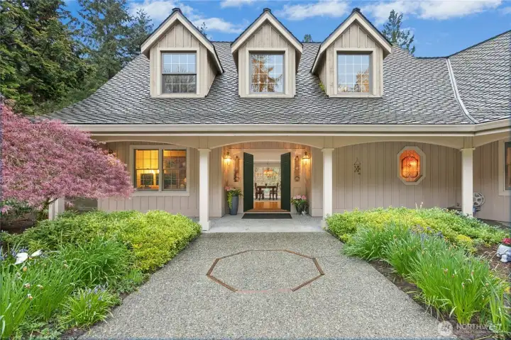 Sun-drenched lot in the SaddleBrook community of four estate homes, backing to a serene creek and offering exceptional privacy in a true Pacific Northwest setting. Lush grounds and a circular drive create a striking first impression. This beautifully appointed Northwest Traditional home features 4 bedrooms, a spacious bonus room, and 2.25 baths. Light-filled interiors, walls of windows, and a French door seamlessly connect indoor and outdoor living. Open living and dining spaces are ideal for entertaining, highlighted by an elegant gas fireplace. The kitchen features a 5-burner gas range, double oven, island, and breakfast nook opening to a 690 sq ft Trex deckâperfect for outdoor dining. The family room, adjacent to the breakfast nook, includes built-ins and a second fireplace, creating a warm and functional gathering space. A main-floor office adds flexibility for work or guests. The main-level primary suite features a walk-in closet, fireplace, spa-like bath with heated floors, and a private deck. Upstairs offers a bonus loft, 3 bedrooms, a full bath, and storage. Large, level backyard with beautiful landscaping. 3-car garage with EV charger. Great location near top schools, Bellevue, Kirkland, and Bridle Trails. Welcome home.