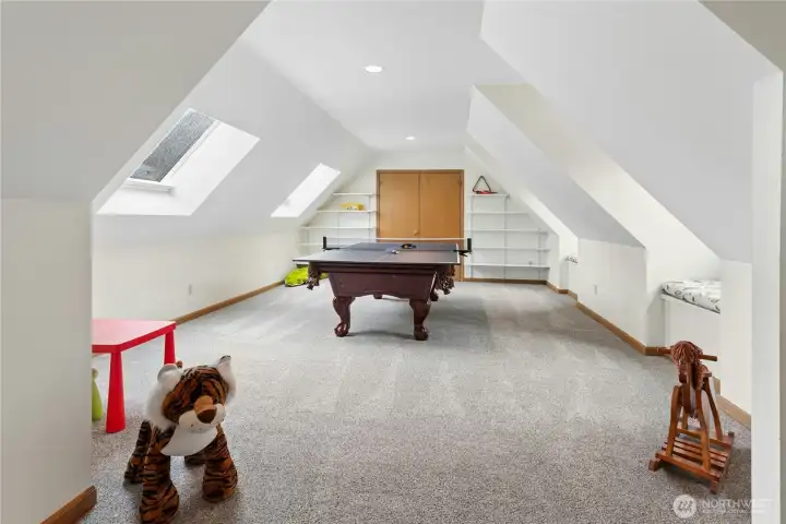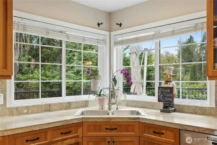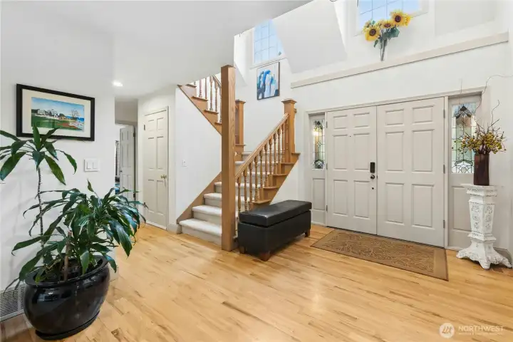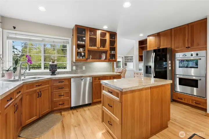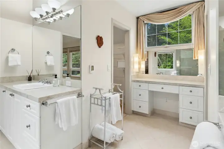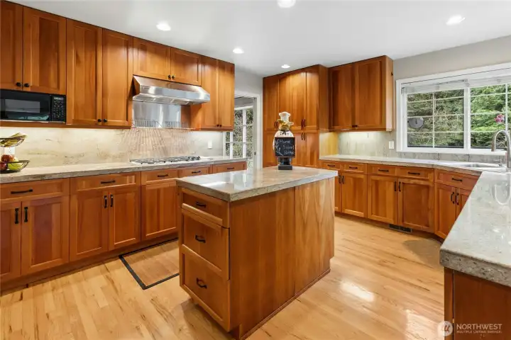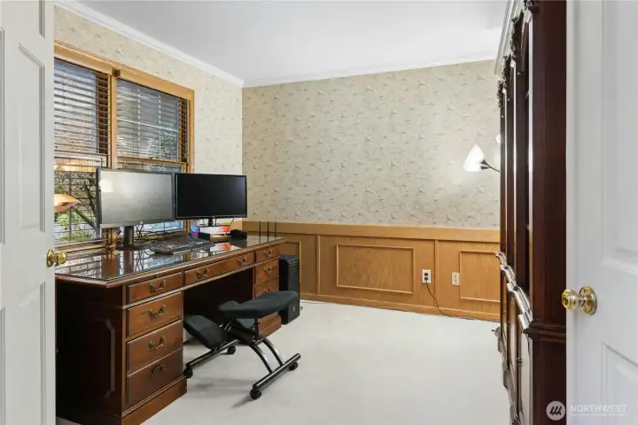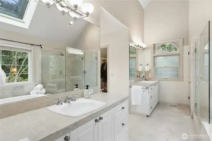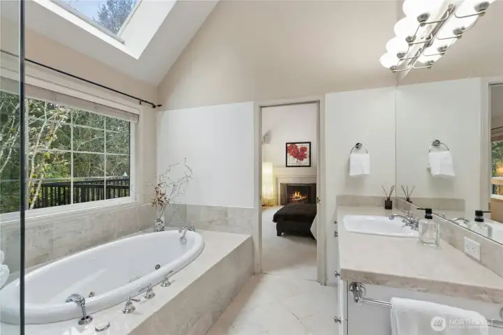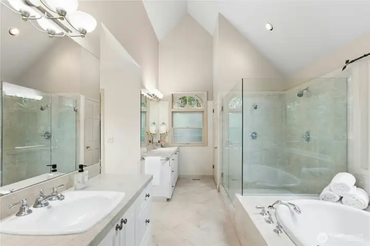 Sun-drenched lot in the SaddleBrook community of four estate homes, backing to a serene creek and offering exceptional privacy in a true Pacific Northwest setting. Lush grounds and a circular drive create a striking first impression. This beautifully appointed Northwest Traditional home features 4 bedrooms, a spacious bonus room, and 2.25 baths. Light-filled interiors, walls of windows, and a French door seamlessly connect indoor and outdoor living. Open living and dining spaces are ideal for entertaining, highlighted by an elegant gas fireplace. The kitchen features a 5-burner gas range, double oven, island, and breakfast nook opening to a 690 sq ft Trex deckâperfect for outdoor dining. The family room, adjacent to the breakfast nook, includes built-ins and a second fireplace, creating a warm and functional gathering space. A main-floor office adds flexibility for work or guests. The main-level primary suite features a walk-in closet, fireplace, spa-like bath with heated floors, and a private deck. Upstairs offers a bonus loft, 3 bedrooms, a full bath, and storage. Large, level backyard with beautiful landscaping. 3-car garage with EV charger. Great location near top schools, Bellevue, Kirkland, and Bridle Trails. Welcome home.