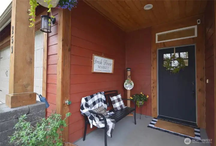 “Covered front porch featuring pine inlay ceiling with integrated can lighting, supported by stone pillars on a solid poured concrete base.”