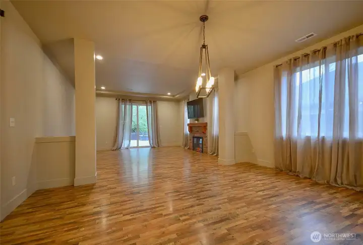 Entry way with distressed laminate wood floors, Coat closet and 4th bedroom/office to the left. 9 ft ceilings throughout the home. Designer paints.