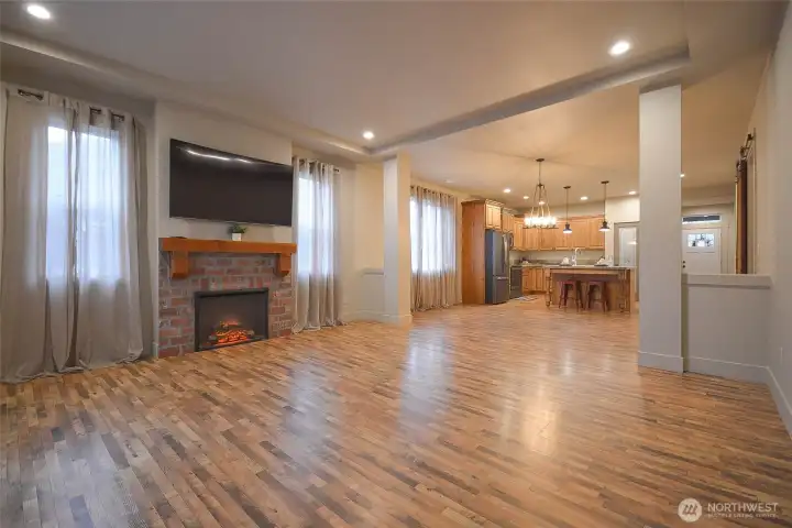 Spacious living room featuring an electric fireplace with a wood mantel and stone inlay, abundant natural light from large windows, and a sliding glass door leading to the covered back patio.
