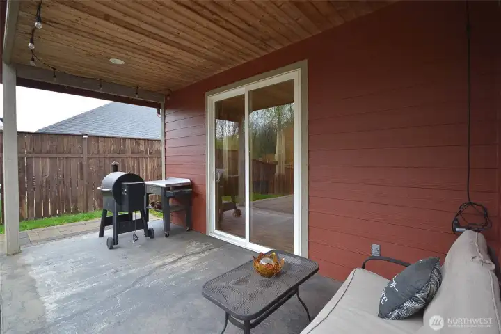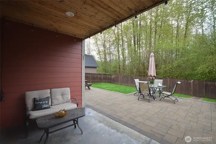 Covered back concrete patio featuring pine inlay ceiling with can lighting—perfect for outdoor entertaining and BBQs. Includes an extended paver patio with a stone fire pit, steps leading to the grassy area, and a gate providing direct access to nearby trails and park.