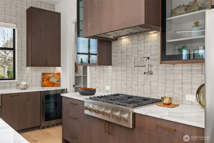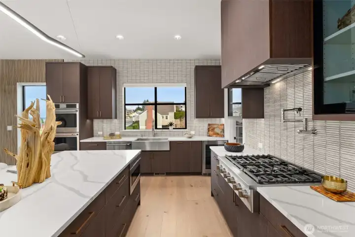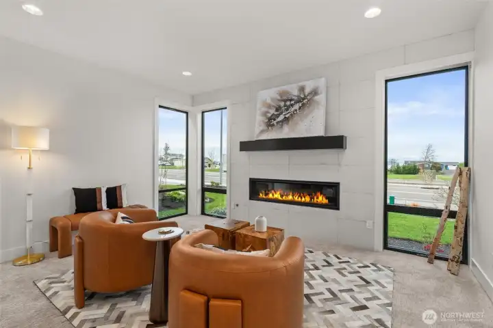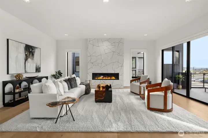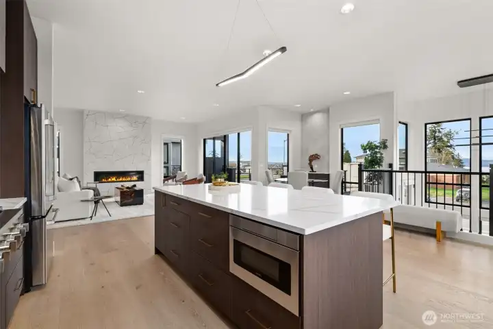 Experience unforgettable sunsets and Puget Sound views from this exceptional home, perfectly positioned on a premium corner lot. A grand two-story entry welcomes you with striking accent walls and dramatic floor-to-ceiling black-framed windows that fill the home with natural light. The chef’s kitchen is a true centerpiece, featuring custom cabinetry, quartz countertops, full-height backsplash, stainless steel appliances, double ovens, and a huge walk-in pantry. The open-concept layout flows seamlessly into the formal dining area and great room, highlighted by a floor-to-ceiling tile surround linear gas fireplace. Enjoy effortless indoor-outdoor living with a large wall slider opening to a covered outdoor space complete with its own linear gas fireplace—perfect for year-round entertaining. The main level primary suite offers a peaceful retreat with a generous walk-in closet and a luxurious five piece ensuite featuring a freestanding soaking tub and tiled walk-in shower. A private guest suite on the main level adds flexibility and convenience. The lower level expands your living space with a stunning second living room with fireplace, additional bedrooms, laundry, and a versatile flex space ideal for a home office, gym, or media room. Located just minutes from Chambers Bay, top-rated schools, and University Place shopping - enjoy all that this coastal living community has to offer!