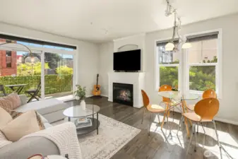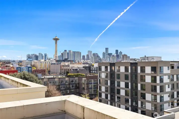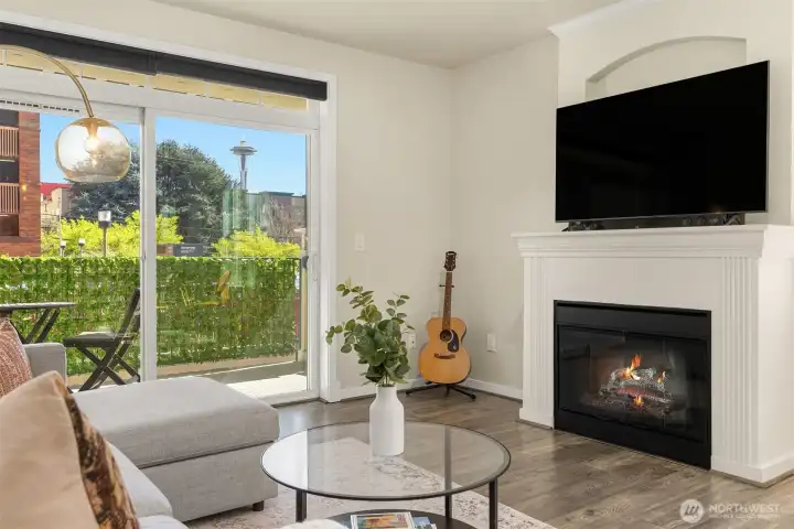 Experience modern Queen Anne living at its best. This light-filled, elevated first-floor condo blends style, comfort, and city energy with stunning Space Needle views from both the living room and bedroom. The open-concept floor plan features a sleek chef’s kitchen with stainless steel appliances, a gas range, and generous counter and cabinet space. Enjoy contemporary upgrades throughout—custom closets, upgraded flooring, an office nook, and in-unit washer/dryer add everyday convenience.Cozy up by the elegant gas fireplace or relax on your private deck overlooking Seattle’s iconic skyline. Building amenities include secure garage parking, extra storage, and a nearly completed rooftop deck perfect for entertaining. Ideally located in the heart of Queen Anne—just steps from cafes, dining, and nightlife—this move-in-ready home puts the best of Seattle right at your doorstep.
