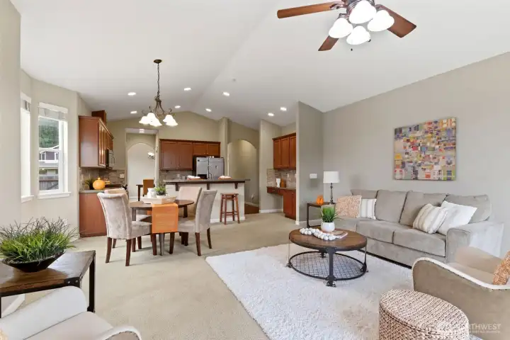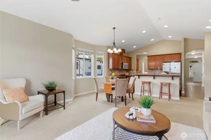 Large, coveted rambler floorplan in the quiet, gated community of Grand Firs. Open concept eat-in kitchen overlooks the living room area with vaulted ceiling and beautiful fireplace with seamless flow to the big, fully enclosed, irrigated backyard. Light and bright throughout the home with 3 generous bedrooms, including the primary with lovely attached primary en suite. The updated home boasts an additional 2 bedrooms, another full bathroom, and large laundry/utility space. 3 car garage, RV parking with paved pad, and oversized gazebo for entertaining all year round. 3 parks in the Grand Firs community for tons of extra space and extracurricular options!