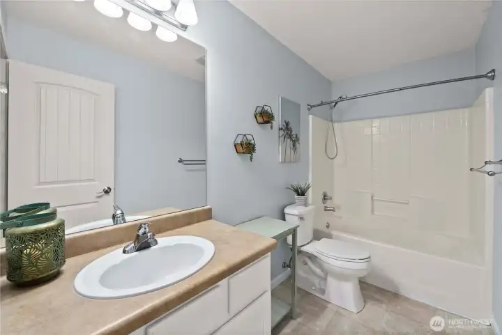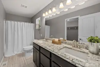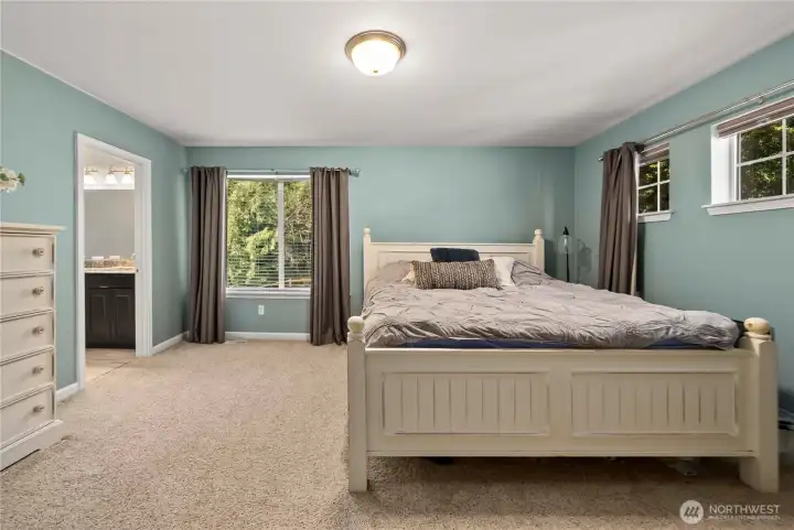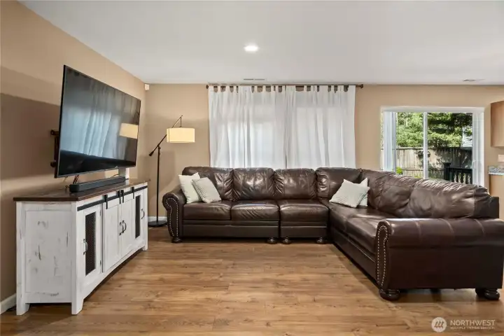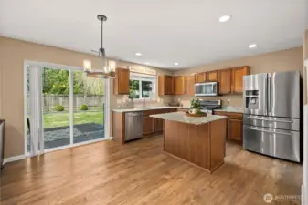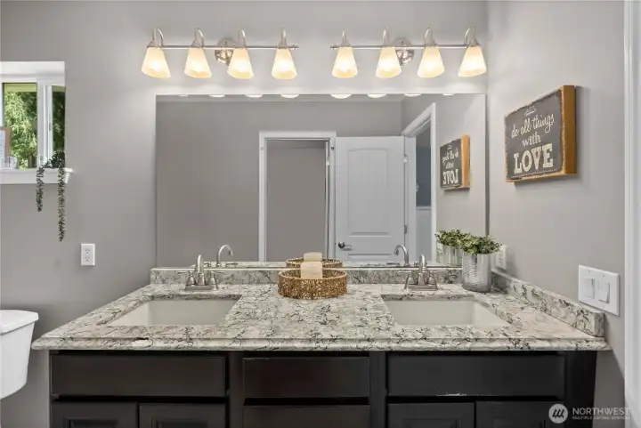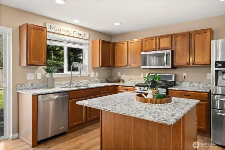 Welcome home to this beautiful residence in one of Bonney Lake's most conveniently located neighborhoods. Perfectly positioned for both convenience & comfort, this home offers an ideal central location, just a few minutes from the freeway for easy commuting, with top-rated schools & everyday shopping only a short walk or drive away. Step inside to a bright, light-filled open-concept living space where the family room & kitchen naturally flow together. Large windows frame views of the generously sized backyard with sprinkler system, custom french drain & entertainment deck, which backs directly to a peaceful greenbelt; creating a private, nature-filled retreat right at home. The chef-friendly kitchen shines with sleek stainless steel appliances, elegant granite countertops, center island, and a clean layout designed for both everyday living & entertaining. The entire main level features beautiful wide-plank flooring that adds warmth and modern style. Upstairs, you'll find oversized, generous bedrooms, each with spacious walk-in closets along with two full bathrooms! This thoughtful layout provides plenty of room for guests, or a home office. Home has it's own separate low-voltage panel & is wired for a generator & has natural gas hookups, perfect for weathering PNW storms. Whether you're looking for convenience, comfort, or that perfect blend of indoor and outdoor living, this Bonney Lake home checks every box. Don't miss your opportunity to make it yours!