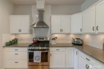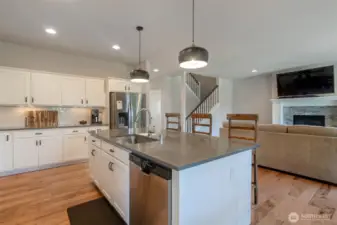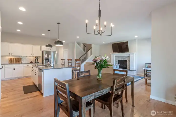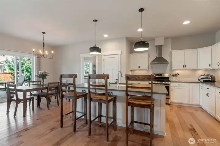 Welcome home to this beautifully appointed craftsman in Stanwood, where thoughtful design meets everyday comfort. The open-concept main level impresses from the moment you step inside, with rich hardwood floors flowing from the welcoming entryway through the spacious living room — anchored by a cozy fireplace — into the chef's kitchen and dining area. The kitchen shines with white cabinetry, a gas range with statement hood, granite counters, a large island with bar seating, and stainless appliances. A main-level office (easily used as a 5th bedroom) adds versatility, while the oversized mudroom and laundry room off the garage keep daily life organized. A full guest bath completes the main floor. Upstairs, the primary suite is a true retreat — vaulted ceilings, a generous walk-in closet, and a luxurious en suite bath with dual vanities, a soaking tub, and a separate shower. Three additional bedrooms, a massive bonus room, and a second full bath with his-and-hers sinks and a private shower/toilet room round out the upper level. Outside, enjoy a covered patio perfect for year-round entertaining, a spacious and private backyard, and a generous side yard — all framed by mature landscaping. The attached two-car garage and wide driveway offer ample parking. This is the one you've been waiting for — space, style, and functionality all in one.
