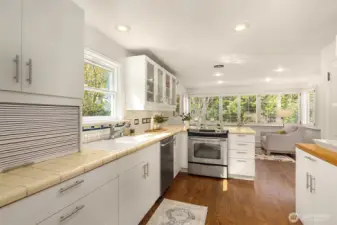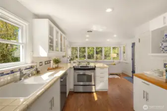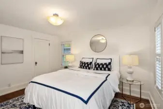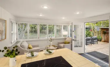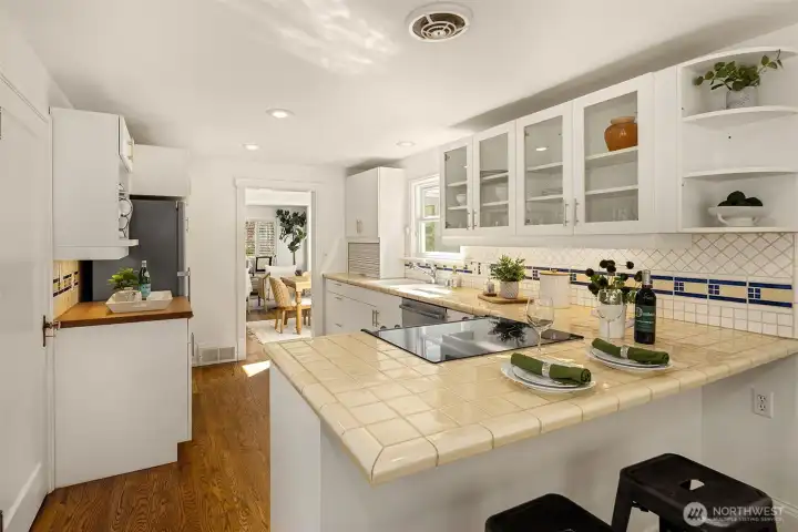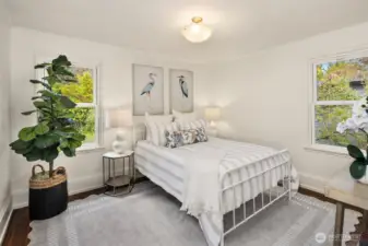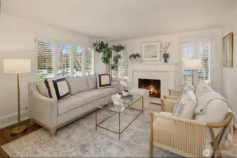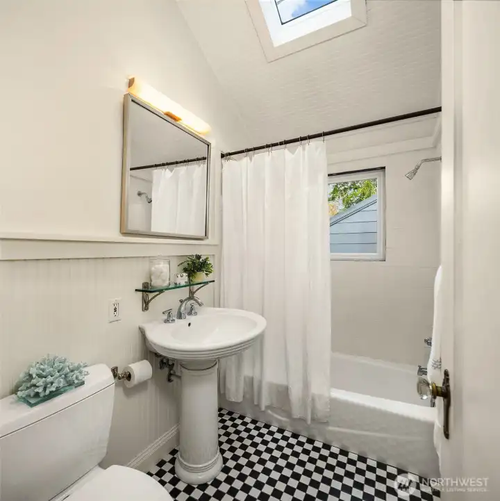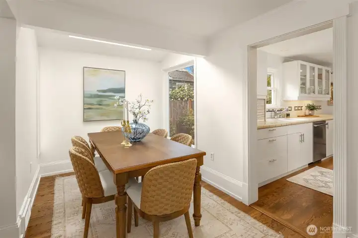 Tucked into the coveted Hawthorne Hills neighborhood, this charming cottage captivates with classic shutters and lush, verdant landscaping. Inside, rich hardwood floors run throughout, while a wood-burning fireplace with a beautiful mantle anchors the warm and inviting living room. A delightful dining nook with skylight fills the home with natural light, and the generously sized kitchen offers a breakfast bar along with an additional sitting or casual dining area—ideal for everyday living. French doors open to an expansive deck, creating effortless indoor-outdoor flow for entertaining or quiet relaxation. Established plantings and mature trees surround both the front and back yards, making this a true gardener’s retreat. Up a few stairs with privacy away from the living spaces, find two well-proportioned bedrooms and a full bath with vaulted ceiling and skylight. Downstairs, you’ll find a dedicated laundry room, abundant storage, and access to the one-car garage. Ideally located near Bryant Park, Metropolitan Market, PCC, the Burke Gilman Trail, and just minutes to Seattle Children’s, Magnuson Park, University Village, and the University of Washington makes this the perfect place to enjoy a happy life!