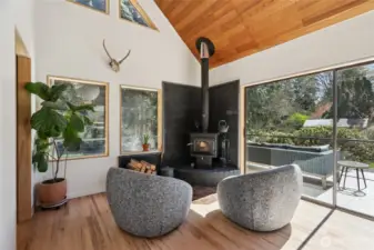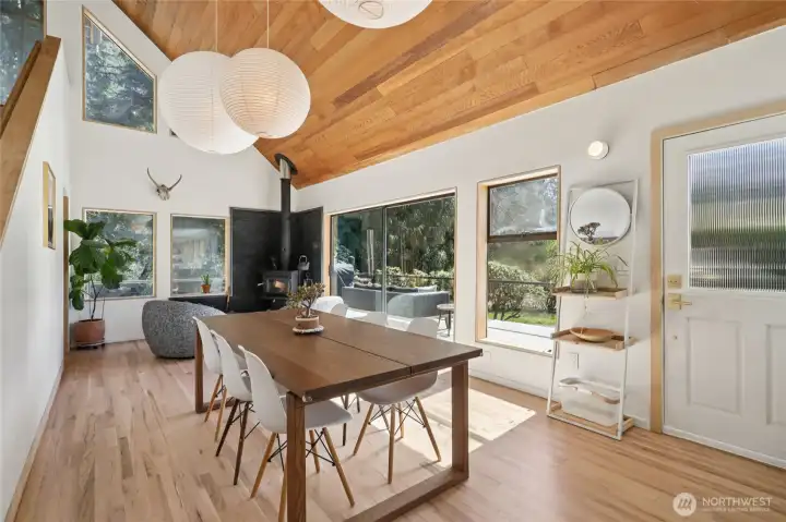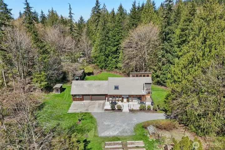 Architecturally curated PNW retreat on 5 private acres, reimagined with a refined, design-forward aesthetic. This spacious 4-bedroom, 2.75-bath home offers 2,469 sq ft of thoughtfully designed living. Nestled in a quiet, private community, the setting offers exceptional serenity, complete with a trail through old-growth forest leading to a scenic overlook with sweeping views of the Olympics. Soaring wood ceilings, skylights, and walls of windows create gallery-like interiors filled with natural light, while oversized sliders open to expansive front and back cedar decks, perfect for seamless indoor-outdoor living and entertaining. Elevated finishes include red oak hardwoods, custom vanities, bespoke built-ins, and modern architectural trim. Spa-inspired European-style wet bath with Tadelakt plaster, volcanic limestone soaking tub, and solid brass fixtures. Thoughtful upgrades include new LED lighting, 200-amp service ready for generator, and efficient 5-zone ductless heat pump/AC system. Outdoor spaces are equally intentional, featuring hot tub, sauna, and curated gardens, along with a greenhouse and custom chicken coop. Impressive 3-car garage spans over 1,000 sq ft and includes a dream shop with 240V and golf simulator. A peaceful, design-forward escape just minutes to amenities.