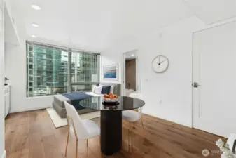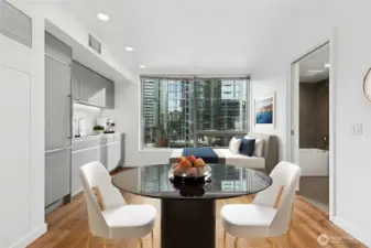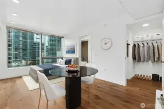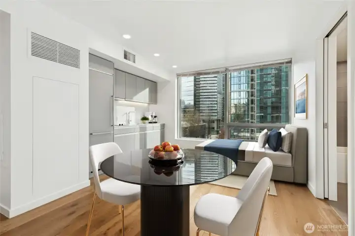 Live at the center of it all in this bright, modern studio at The Nexus, featuring breathtaking 180° views of downtown Seattle and abundant natural light from a large picture window. The smart, stylish layout offers an in-unit washer/dryer, spa-inspired bath with rain shower, and a spacious walk-in closet. Pet-friendly living with a private dog run and wash station. Enjoy three floors of resort-style amenities, rooftop Sky Club, concierge, fitness center, lounges, and entertainment spaces—just steps from dining, shopping, transit, and nightlife with a Walk Score of 98, at the heart of Seattle.