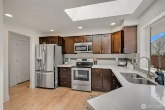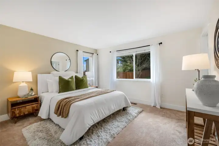 Beautifully positioned, end of cul-de-sac lot, nestled in a quiet neighborhood w/low maintenance PNW vegetation surrounding the fully fenced, level yard. This picturesque setting includes an array of updates inside and out along with many lifestyle conveniences to include new flooring, fresh paint, A/C, gas fireplace, kitchen pantry, recessed lighting and cabling for TV mount, stainless appliances to include a large capacity double door fridge, double shower heads within remodeled Primary bath, walk-in Primary closet, dedicated laundry room with sink, sliding door off kitchen/dining spaces to fenced backyard with expansive outdoor entertainment patio, firepit and large garden shed. Located close to all major conveniences, coveted schools, public transit options, parks & Silver Lake. Professional pre-inspection and sewer scope completed.