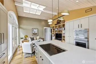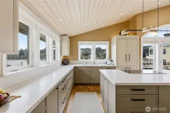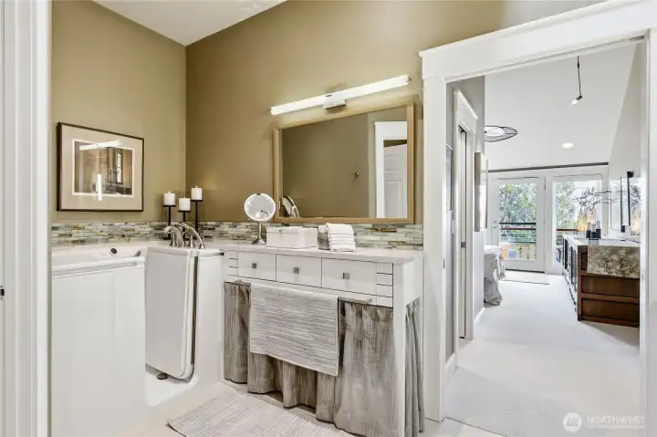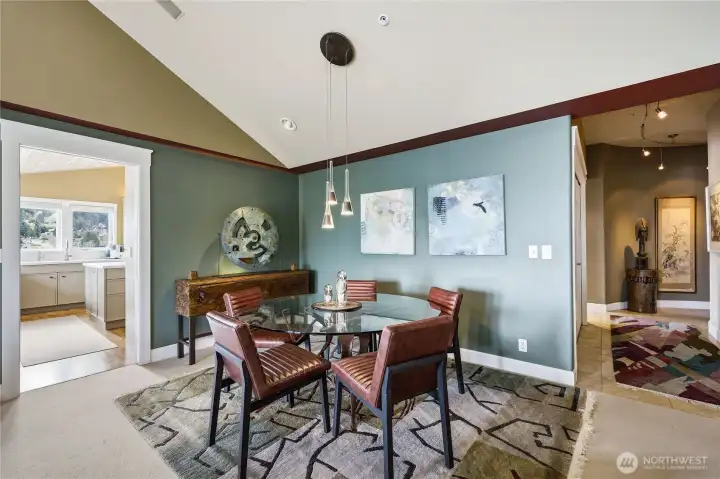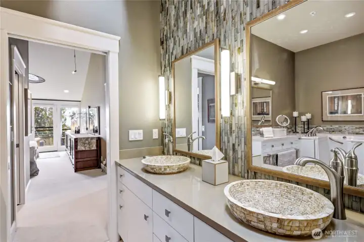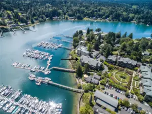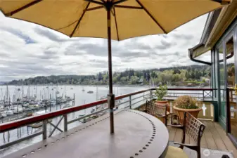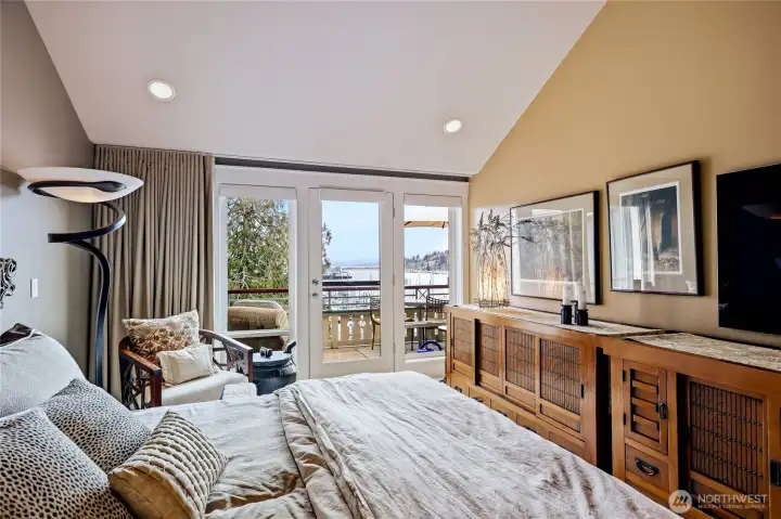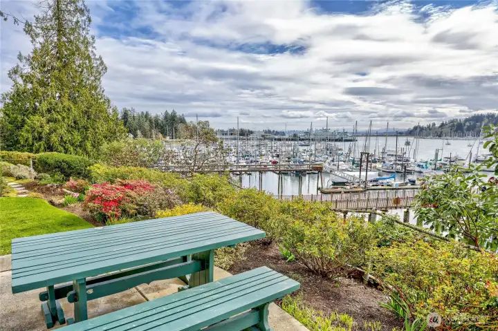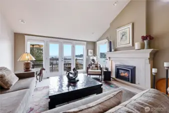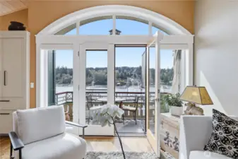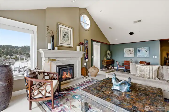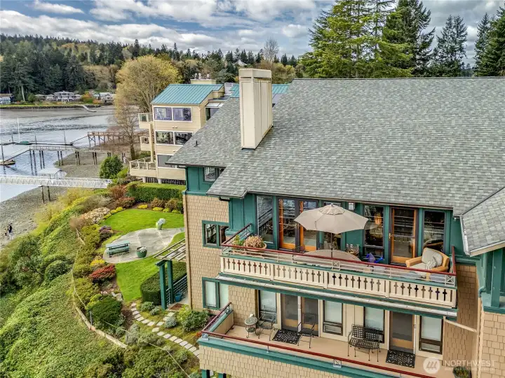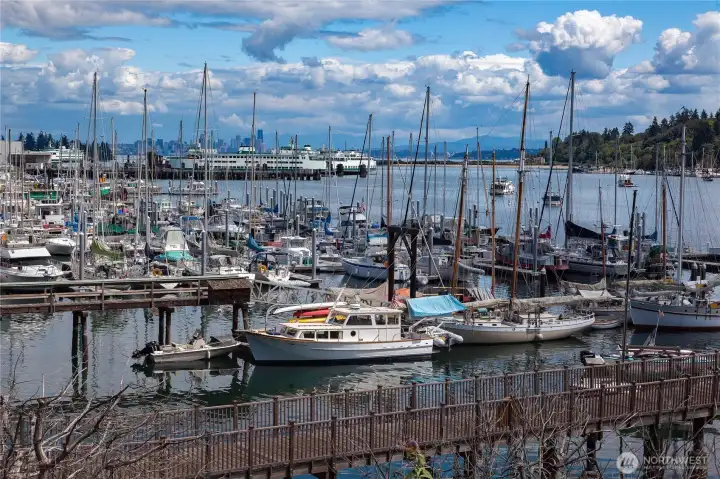 Wake each morning to shimmering water, sailboats drifting across Eagle Harbor, and the Seattle skyline rising in front of the Cascades. Close to Winslow for coffee, dinner out, or the Seattle ferry. This rare waterfront penthouse condominium offers a front-row seat to the rhythms of the marina and the quiet beauty of Bainbridge Island living. Sunlight pours through expansive windows and vaulted ceilings, while French doors invite you to step out on one of the balconies and take it all in. Thoughtfully reimagined, this home blends warmth and sophistication with a fully remodeled kitchen featuring Thermador appliances, custom cabinetry, sintered stone countertops from Spain, and a striking hemlock ceiling with a beamed skylight. The serene primary suite includes a spa-like bath with heated floors, handmade mosaic tile and a Kohler walk-in tub. Every detail supports comfort and ease- from an elevator that opens right into your front entry, custom built-ins and California closets to upgraded systems such as a heat pump, HEPA filtration and solar back-up power. A home that feels both elevated and grounded - where every day begins and ends with the water, the best of Winslow is just outside your door.