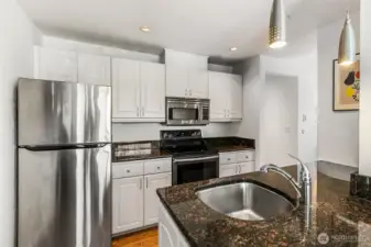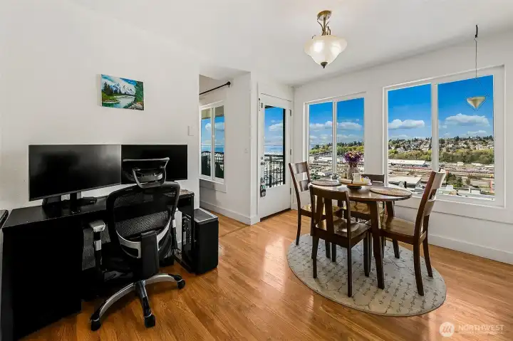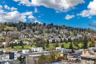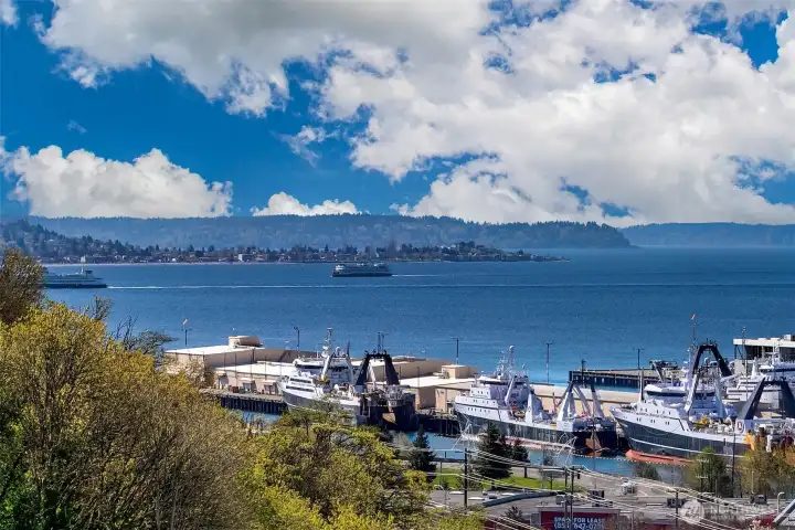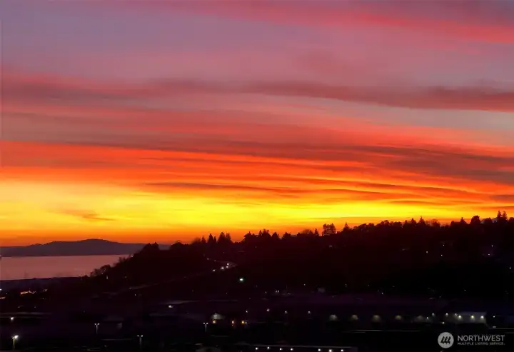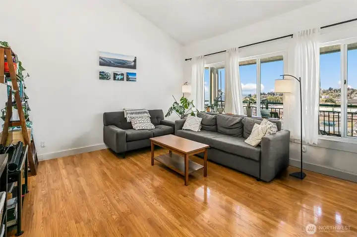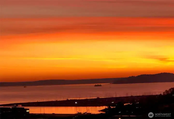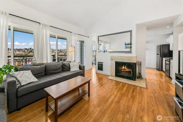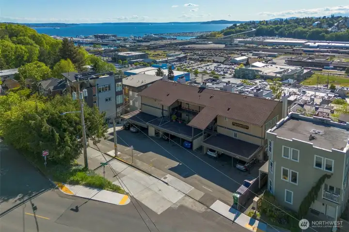 Capture breathtaking sunsets and cruise ships from this bright and sunny top floor unit with stunning water views! This 2-bed, 1.75-bath condo features a spacious 1,052 sq ft layout with a private lanai perfect for entertaining. Enjoy comfort with wall remote A/C in both the living room and primary bedroom, a marble fireplace, and vaulted ceilings. The formal dining room flaunts picture windows, while the open kitchen impresses with slab granite counters and an eating bar. Retreat to the primary suite with an ensuite bath and large walk-in shower. Secure your spot in this serene, well-managed building with covered parking and a storage locker. Just moments from Queen Anne's eateries, Interbay and Downtown!