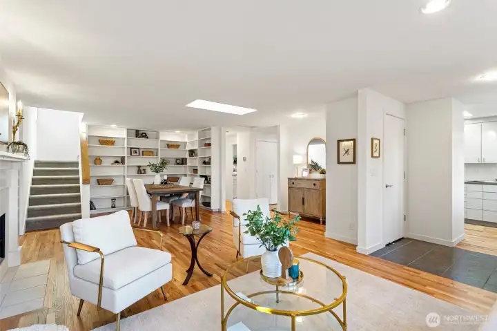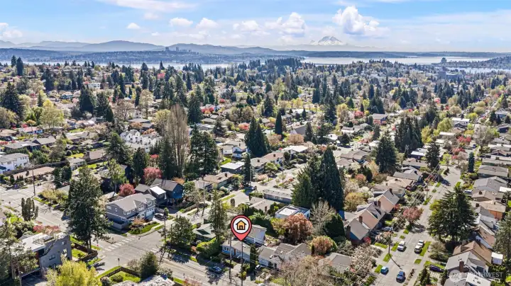 This beautifully reimagined 1955 Bryant home blends timeless mid-century charm with thoughtful modern expansion. A desirable main-floor layout features a stunning updated chef kitchen, convenient main-level bedroom suite, 2nd bedroom & bathroom, all while preserving the home’s original character. Upstairs features a 2nd primary suite & bedroom/office, creating flexible or multi-generational living. Enjoy the stunning Mt. Rainier view from the upstairs! Space & flow are maximized throughout with custom built-ins that add both beauty & smart storage. An additional eating nook seamlessly connects to outdoor living, making everyday life & entertaining effortless. The former garage has been converted into a versatile workshop, complemented by a separate laundry/utility room. The backyard is designed for gathering & relaxation, featuring a newer hot tub & an enchanting little reading cottage. Solar panels & A/C provide energy efficiency & year-round comfort. Ideally located in highly desirable Bryant with easy access to parks, playfields, & Magnuson Park. Enjoy walkability to nearby shops & eateries, sought-after schools, and an easy commute in every direction. A rare opportunity to own a beautifully expanded mid-century home in one of NE Seattle’s most beloved neighborhoods. This is more than a house — it’s a place to gather, grow & truly feel at home.