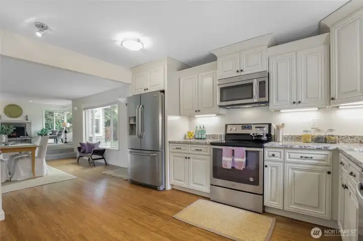 Bright, spacious kitchen with custom cabinetry, stainless steel appliances and its own exterior door for easy outdoor access