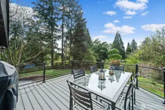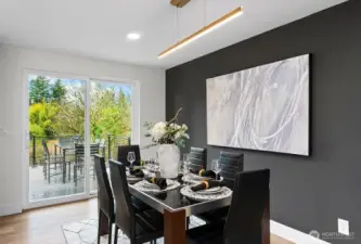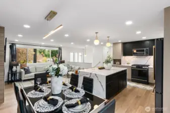 Tucked at the end of a quiet cul-de-sac and backing to a serene park, this beautifully updated split-level home offers modern living with privacy and natural light. Set on a manicured, sun-filled quarter-acre lot with mature trees, the setting is both open and secluded. Inside, enjoy a fully remodeled interior with contemporary finishes throughout. The stunning kitchen features a slab quartz waterfall island, custom cabinetry, under-cabinet lighting, and pop-up charging stations. Wide-plank LVP flooring and tile run throughout—no carpet. The open main level is anchored by a striking gas fireplace and modern lighting. The primary suite offers a spa-like bath with a freestanding soaking tub and a large walk-in shower. The lower level includes two bedrooms, a spacious rec room with a wood-burning fireplace, and a finished laundry room. Recent updates include a new tankless water heater, new windows, and fresh interior and exterior painting. Outdoors, enjoy a landscaped yard, private patio with dining area, and a composite deck with modern railings—perfect for relaxing and taking in park views. The roof is approximately 8 years new. A true turnkey home in one of Juanita's most desirable locations.