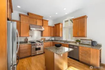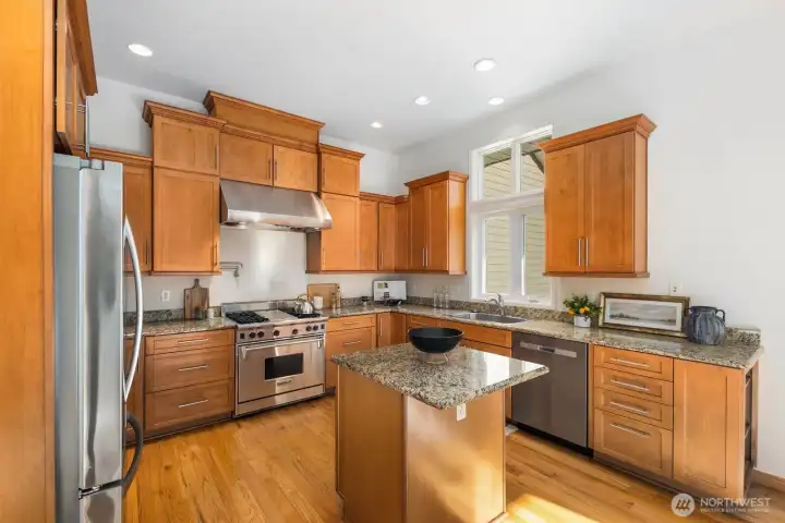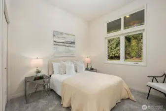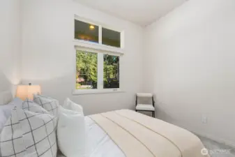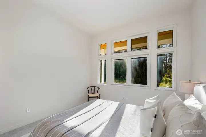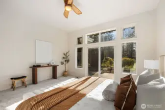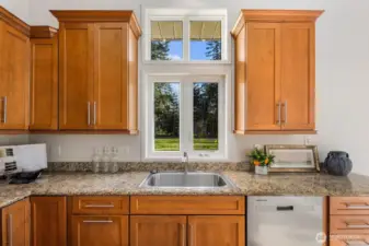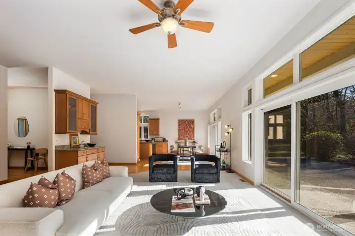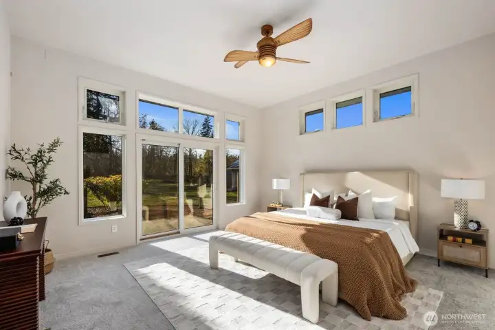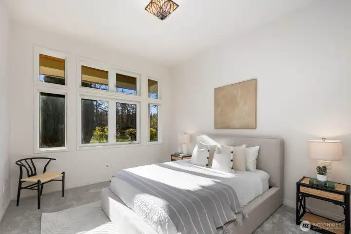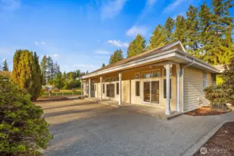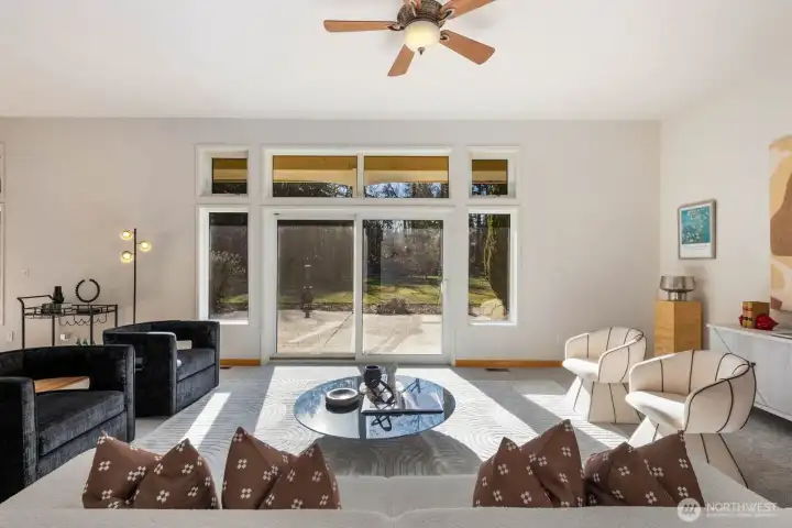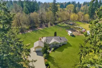 This 2,030-square-foot custom-built rambler features 3 bedrooms and 2 bathrooms, situated on a level 2.4-acre lot. The home has been livingly refreshed with new interior paint and brand-new carpet, complemented by floor-to-ceiling windows that provide natural light and views of the private lot. Hardwood floors run throughout the living spaces, leading to a kitchen finished with Viking appliances and solid surface countertops. The primary suite includes a large closet with custom built-ins, an attached full bath, and direct access to an expansive covered back patio with tongue and groove cedar soffits. Beyond the covered area, a large poured concrete patio features hot tub hookups, offering a significant footprint for outdoor living. The property includes a detached two-car garage with a shop, an additional storage shed, and a massive garden space with berry bushes and fruit trees ready for this year's planting. Essential infrastructure enhancements include an automatic whole-house generator and private well. Backing up to a protected greenbelt, this estate offers a private setting while maintaining efficient access to Highway 18 for commuters.
