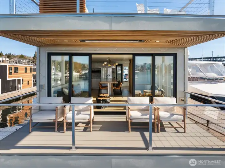 Expansive wall sliders fully open to a heated view deck with stunning, unobstructed city & lake vistas.