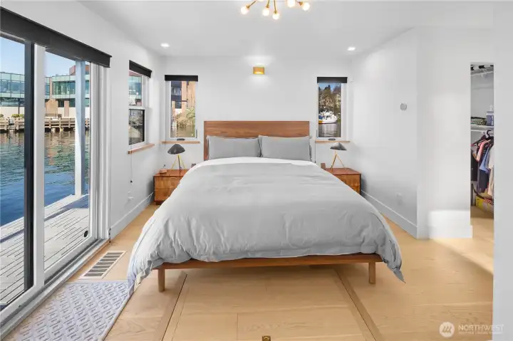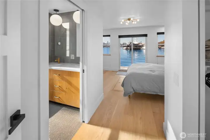 Primary suite on the main level with a lux bath and sliding doors opening to the deck—perfect for a morning dip, paddle board or coffee and croissant over the water.
