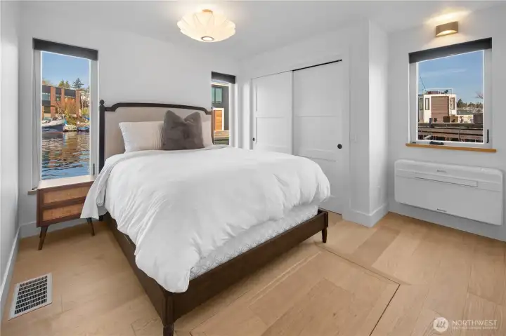 A thoughtfully designed layout features a private primary suite on the main level with a lux bath and sliding doors opening to the deck—perfect for a morning dip, paddle board or coffee and croissant over the water. The entry level includes an additional bedroom & second lux bath, ideal for guests or flexible living.