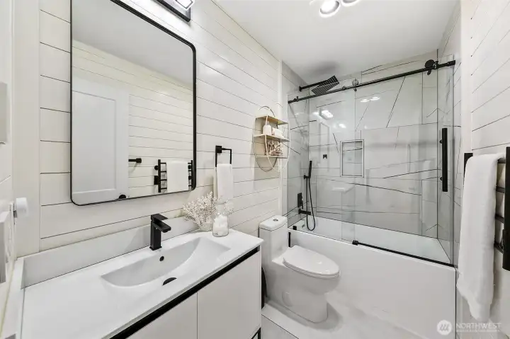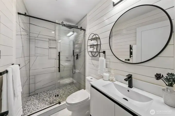 This beautifully remodeled home is flooded with natural light and completely remodeled. The owner spared no expense during the extensive remodel that includes new hardwood floors, new kitchen and bathrooms with features like in-floor heating, adding air conditioning and a new laundry room, extensive built-ins and cabinetry, adding a wine cellar and new stairs...the list is long and the result is a home that surpasses all but the most luxurious of new construction homes. Location is a commuter's dream with less than a mile to I-405 and the park and ride. Excellent services just a few blocks away like PCC market and QFC and great restaurants and cafes. In the highly rated Northshore School District. Community features sports court and walking trails.