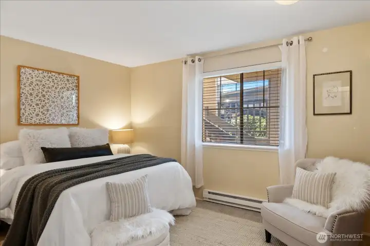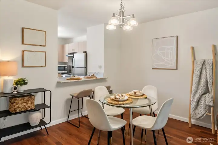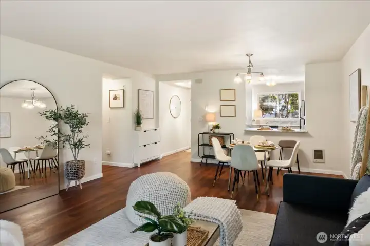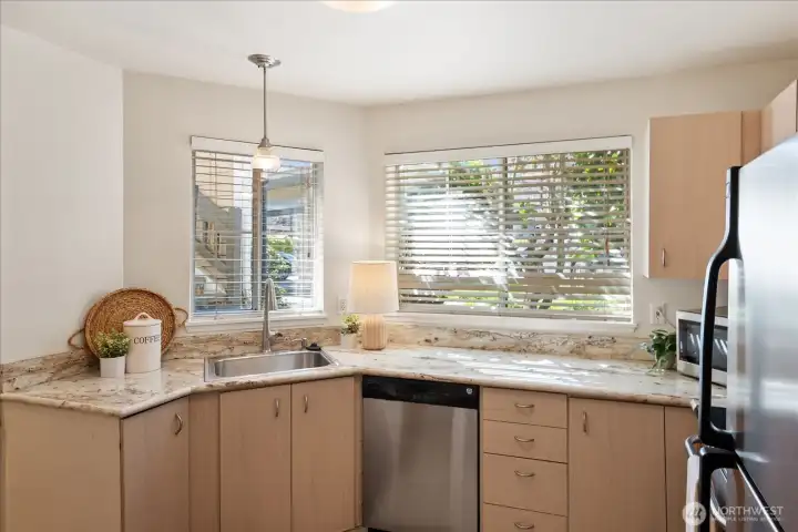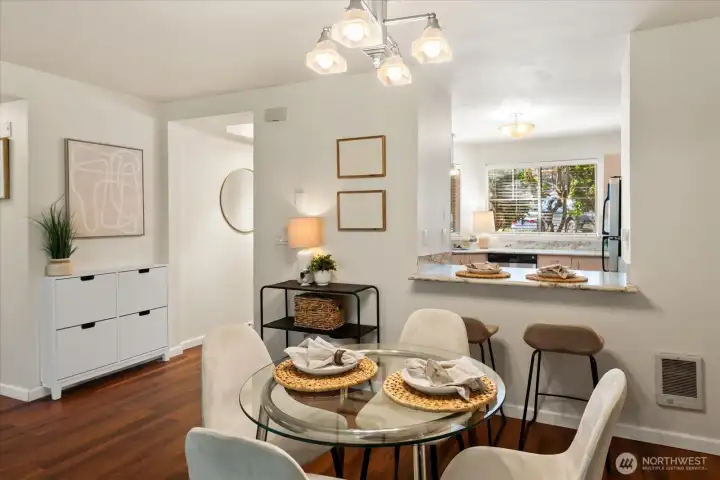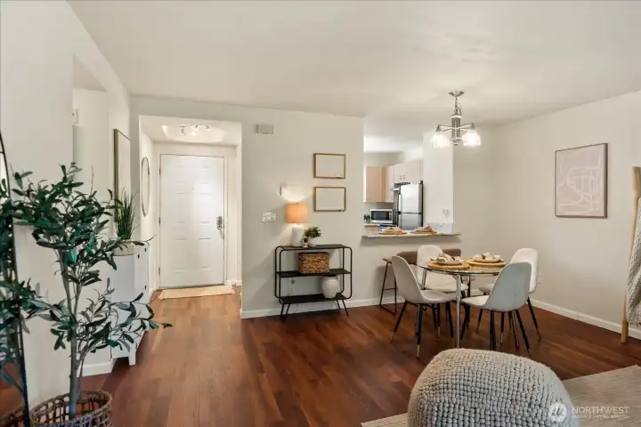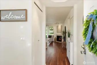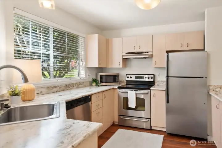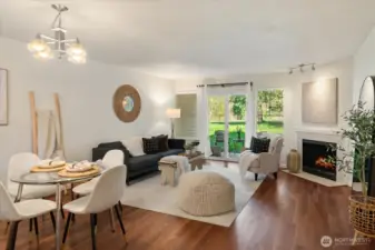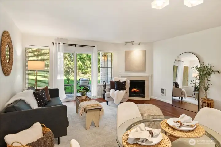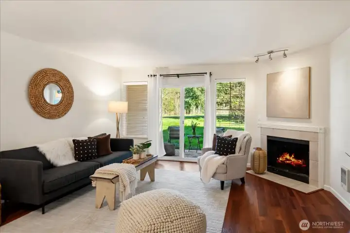 Welcome to this charming ground-level condo in desirable Mukilteo! The inviting living room offers a warm, comfortable atmosphere with a cozy fireplace and direct access to the back patio. The kitchen features stainless steel appliances and a convenient serving peninsula, providing ample counter space for both everyday living and easy entertaining. Beautiful LVP flooring throughout the main living spaces. The bedroom has nice carpet and built-in closet storage. The bathroom offers an oversized vanity with generous counter space and a walk-in shower. Additional highlights include a newer and full sized in-unit washer and dryer with extra storage on the patio, and COVERED parking! This 1 bedroom unit is larger than the other 1 bedroom units in the complex, and you will feel the spacious difference! This is a convenient location near schools, shopping, and dining. No rental cap!