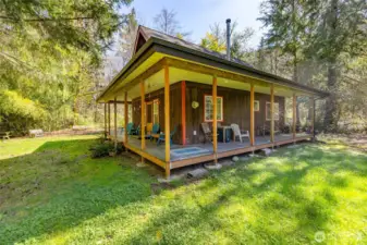 Experience the beauty of nature tucked away in the woods, this lovely 2-bed, 1.5 bath cabin is perfect for weekend getaways or a quiet place to call home. Enjoy the spacious wrap around porch, perfect for morning coffee or unwind inside where the warmth of the wood and thoughtfully decorated cabin create a cozy retreat. The soaring ceilings and windows create an open natural feel. Multiple outbuildings include a 3-stall pole building, ideal for vehicles, projects or storage, tool shed, woodshed, a small cottage, plus the original cabin is still standing with loads of potential with some TLC. Garden space galore, fruit trees, trails, beautifully wooded and open grassy spaces complete this lovely 5-acre property. The possibilities are endless. Located on a private gated drive you are minutes from town where you will have tranquility and convenience. Partially furnished. New roof in 2017 & new drainfield in 2020. Your serene, wooded escape awaits!