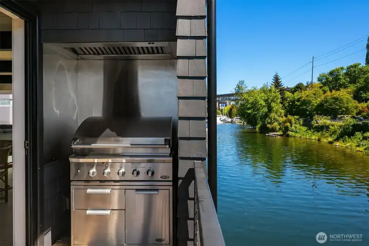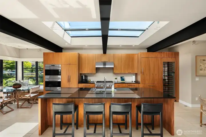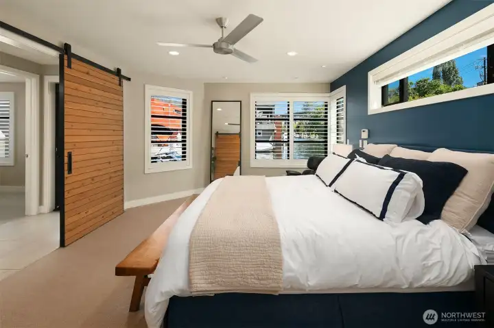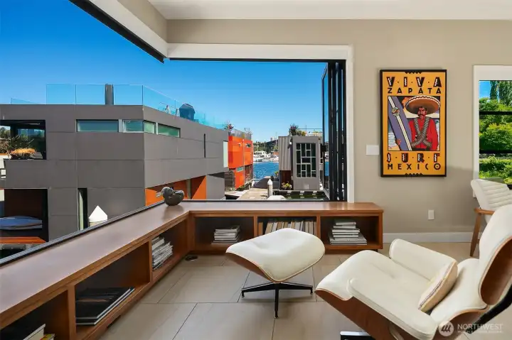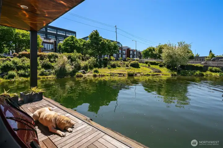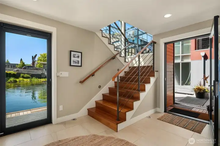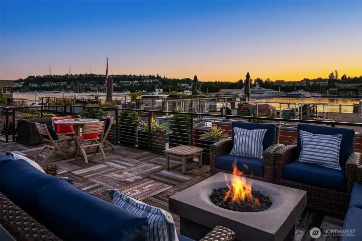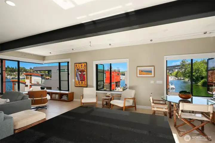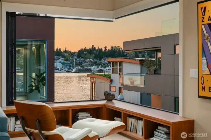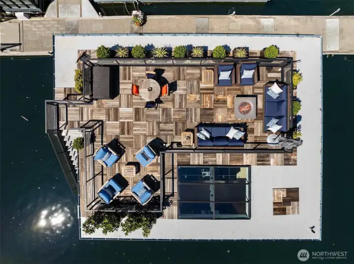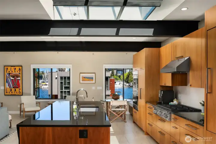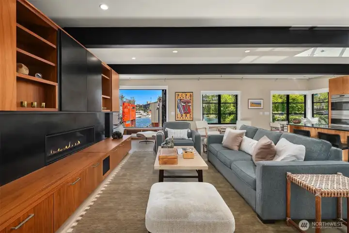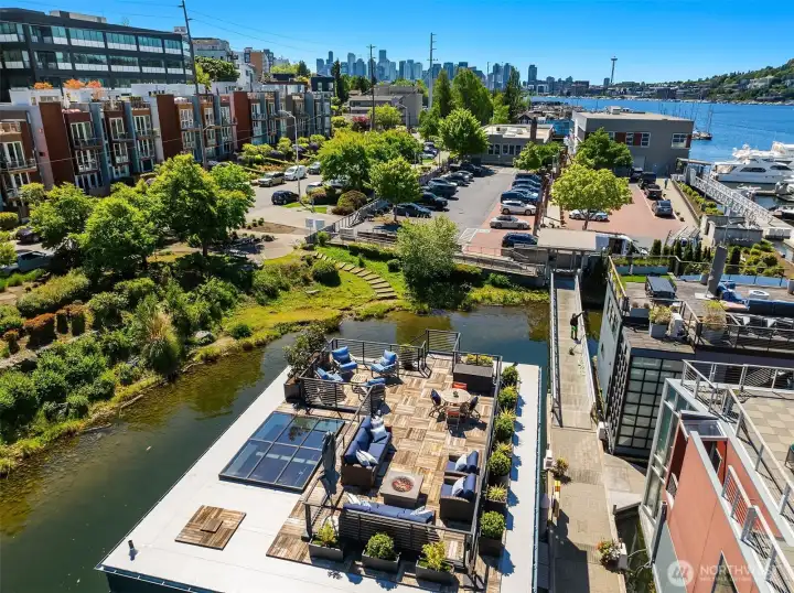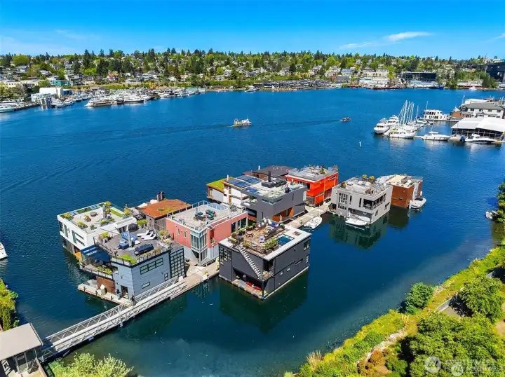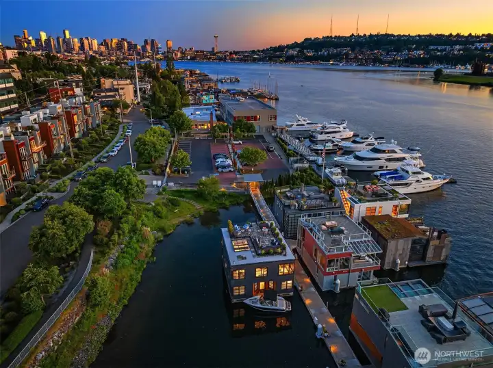 Stunning gated residence in the boutique, 12 slip community of Wards Cove. State of the art design built by Dyna Construction in 2015 with 30ft steel beams. Second floor Great Room with Chef's skylit kitchen, top of the line appliances include a Sub Zero refrigerator, built-in wine refrigerator, under counter fridge & freezer drawers, a Miele dishwasher & Wolf gas range. Custom Walnut cabinetry throughout, cold rolled steel fireplace & corner nano-window reading nook. The main floor offers 3 bedrooms (spacious primary suite with one of the largest walk in closets I have seen on a floating home), laundry & storage. Moorage for up to 25ft boat. Roof deck with views of Lake Union, 4th of July fireworks & glorious sunsets. Huge, 1200sf basement with tons of storage has 5ft+(approx) ceiling height. There are also 2 large exterior storage rooms for bikes and gear. Automated blinds & Lutron lighting. Radiant heated tile floors keep you warm all year & AC cools for summer. Brand new roof in 2025. Brand new Tankless hot water heater/boiler & AC in 2026. Gated, secure parking space. Fee simple ownership. One-of-a-kind Lake living in Seattle!