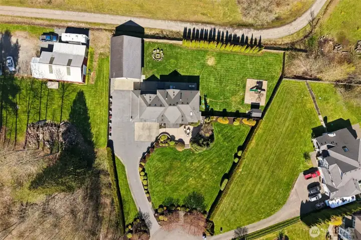 Pristine gated estate nestled on a private, level 1-acre fenced setting in coveted Fordham Meadows, where refined design and exceptional craftsmanship create a truly elevated living experience. A dramatic 18-foot entry sets an impressive tone, while expansive windows bathe the interiors in natural light. The main level unfolds with graceful formal living and dining spaces, complemented by a spacious family room centered around a striking fireplace—perfect for both intimate gatherings and everyday comfort. The updated kitchen is thoughtfully designed with engineered hardwood floors, sleek quartz countertops, and a stunning wood barn door pantry that adds both charm and function, creating an ideal space for cooking and entertaining. A sophisticated den with custom built-ins and an expansive bonus room offer remarkable flexibility for a variety of lifestyles. Outdoors, the grounds are equally captivating, featuring a relaxing hot tub and open space to enjoy year-round. A substantial 30x42 shop with 14-foot doors and a 7-car garage provides abundant room for hobbies, storage, and more. Complete with air conditioning and convenient access to I-405, this exceptional property offers a rare blend of privacy, luxury, and convenience.