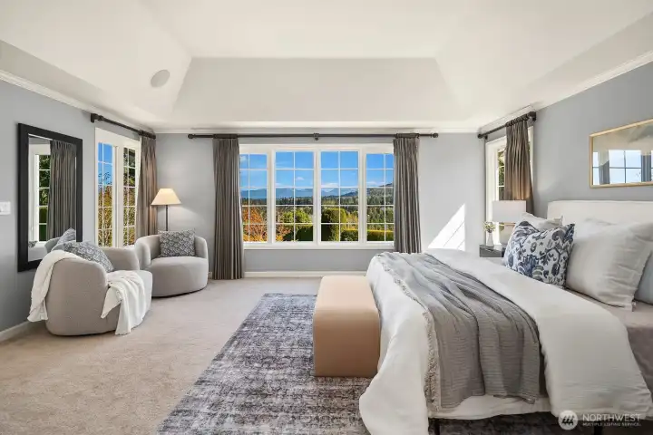 Turnkey ready at Uplands on the Plateau, one of Sammamish's most sought-after communities. This stunning 4-bedroom, 2.25-bath home spans 3,400 square feet of thoughtfully designed living space, offering the perfect blend of elegance and functionality. Soaring vaulted ceilings and rich hardwood floors set the tone from the moment you enter, while formal living and dining rooms provide an elevated backdrop for entertaining. The gourmet kitchen is a true showpiece, featuring ample storage and sweeping views of the private backyard. A dedicated main-floor office bathed in natural light serves beautifully as an optional fifth bedroom. Every bedroom is thoughtfully positioned to offer privacy and comfort. Retreat to the expansive upper-level primary suite where breathtaking mountain and backyard views greet you each morning, complemented by a five-piece luxury bath and generous walk-in closet. Three additional bedrooms and a bonus room complete the upper level. Updated windows, a newly treated roof, and central AC throughout add year-round comfort and peace of mind. Outside, entertain and unwind on the expansive back patio surrounded by meticulously maintained landscaping, a crackling firepit, and true privacy, all framed by breathtaking mountain views that remind you exactly why you fell in love with the Pacific Northwest. Located within the award-winning Issaquah School District. This is Sammamish living at its finest.