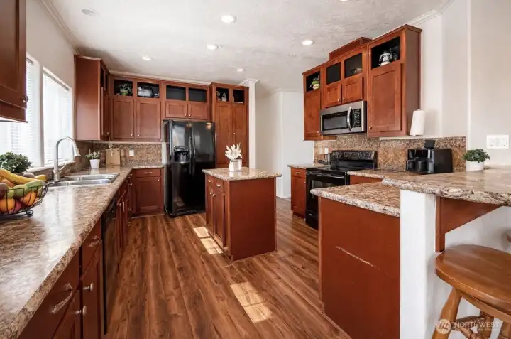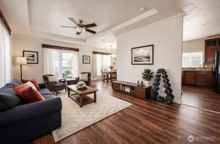 Well-maintained 3-bedroom, 2-bath home located in Valley View Mobile Home Court featuring an open-concept floor plan with vaulted ceilings and abundant natural light. Spacious living area flows seamlessly into the dining space and kitchen, complete with a breakfast bar, ample cabinetry, and tiled backsplash. Functional layout offers two secondary bedrooms and a full bath off the main hallway, along with a conveniently located utility room with exterior access. Private primary suite positioned at the end of the hall includes an ensuite bath with soaking tub, vanity, and linen storage. A great opportunity for comfortable and easy living!