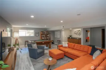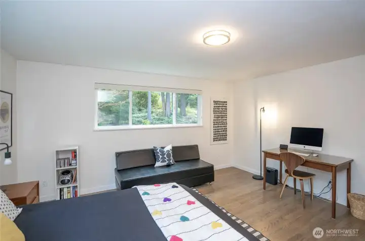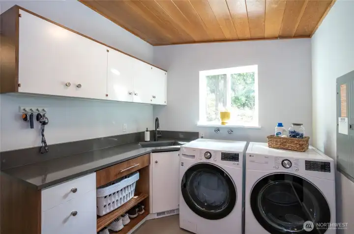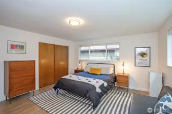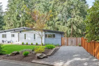Expansive and thoughtfully curated midcentury ranch, originally built in 1962, blending timeless character with modern updates. A level entry opens to a stone foyer and a striking great room with vaulted beamed ceilings and a dramatic slate fireplace. Brand new double paned windows fill the home with natural light, highlighting new hardwood floors and a design approach that honors midcentury modern style with clean lines and a desirable aesthetic. The updated kitchen features quartz countertops, stainless appliances, and refined finishes that complement the home’s architectural roots. Four spacious bedrooms retain original millwork, built-in closets, and endless charm. Bathrooms have been refreshed with a cohesive, modern touch. Outdoor living shines with west facing elevated decks ideal for relaxed entertaining, surrounded by extensive landscaping & fencing improvements that enhance privacy and curb appeal. The daylight lower level offers a large rec room with fireplace and generous flex space, perfect for a creative studio, home office, or future ADU. Complete with carport, RV and boat parking, and set on a quiet cul-de-sac corner lot in a secluded Lakewood neighborhood, just minutes from water recreation, beautiful parks, public & private golf options, excellent schools, and close to JBLM. This is a home you need to experience in person to fully appreciate its space, light, and design.