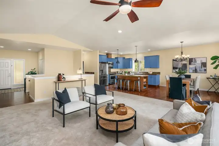Ready to make lakefront living a reality? This private retreat offers 69 ft of waterfront on Lake Kayak, a serene 16-acre resident-only lake—just in time for summer. Enjoy your private dock for swimming and fishing, plus an aluminum boat included—perfect for exploring this stocked lake. Bring your paddleboards and floaties and start making memories.This spacious 3,000+ sq ft home offers flexibility and comfort with a main-level primary suite featuring a walk-in closet and 5-piece bath, plus a generous second bedroom on the main. The open-concept layout showcases vaulted ceilings, a gas fireplace, and a view deck overlooking the lake and surrounding nature.The lower level features a large rec room and three additional rooms—ideal for bedrooms, office, or fitness space. Plenty of storage with a 2-car garage, off-street parking, and extra space for all your gear.Recent updates include heat pump with A/C, newer water heater, washer/dryer, dishwasher, whole-home generator, gutter guards, Starlink, deck heater, and rebuilt deck/dock sections.The yard features raised garden beds and a large fenced area. Community perks include a private 5-acre park with trails, sandy beach, picnic area, BBQ pits, and boat launch.