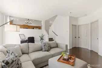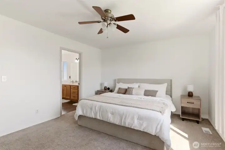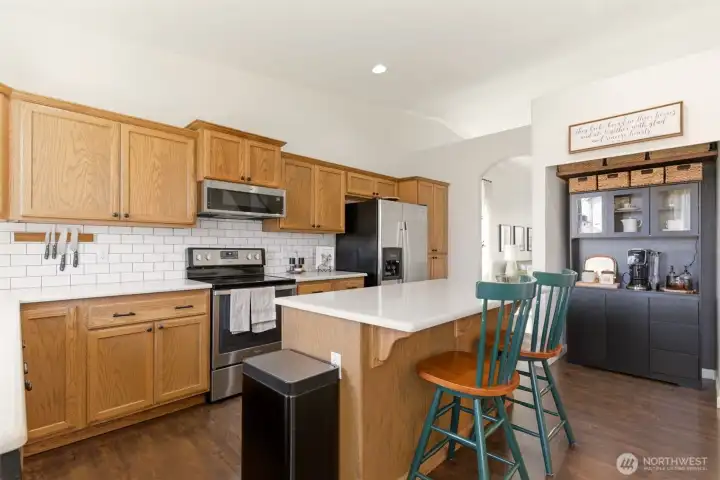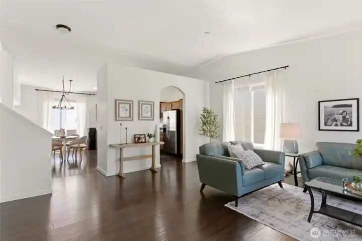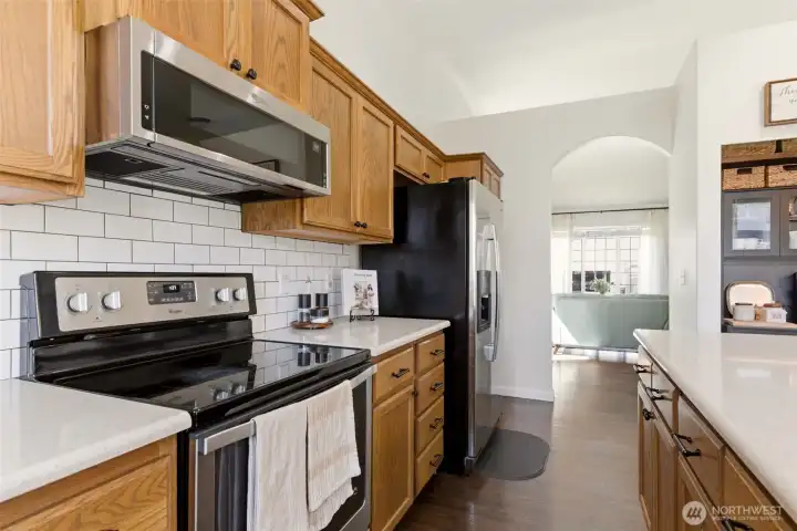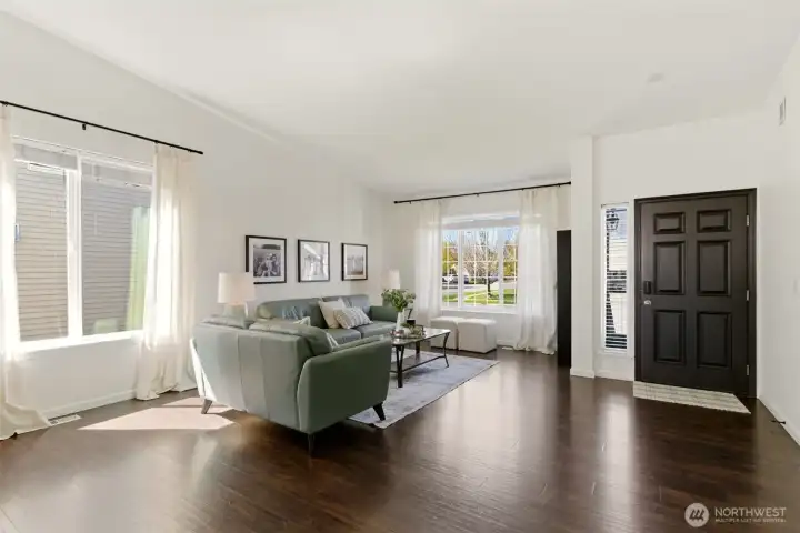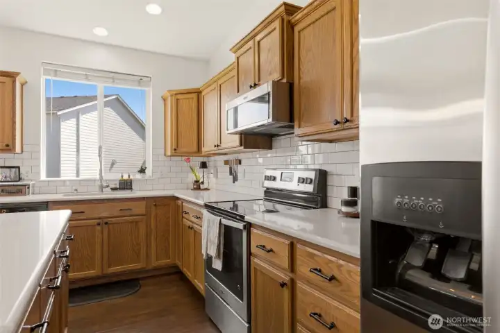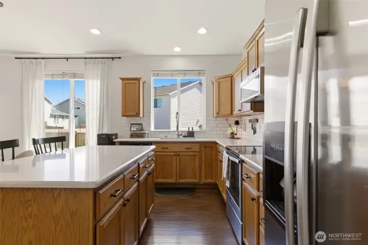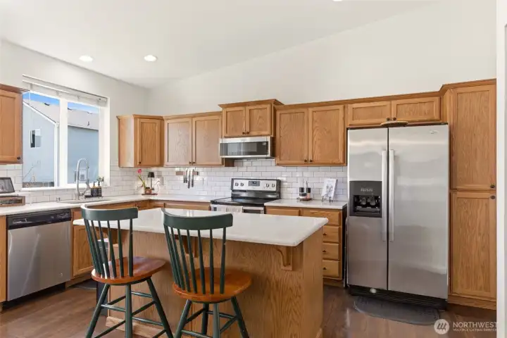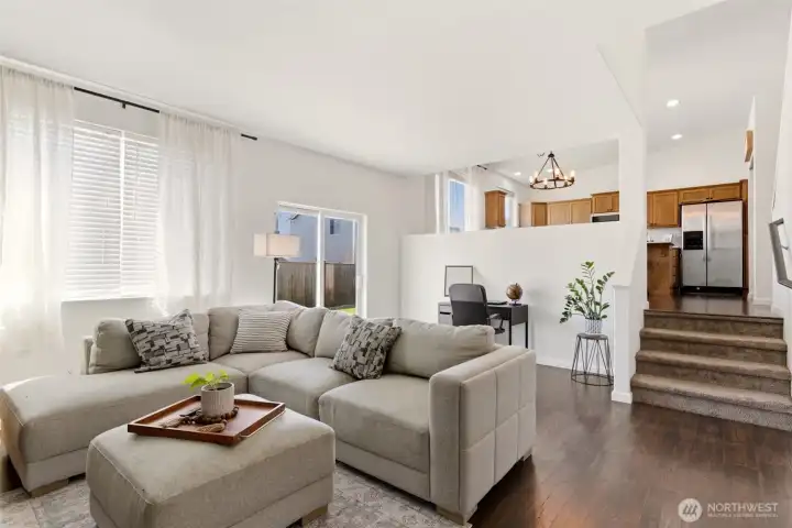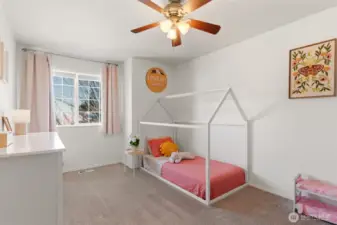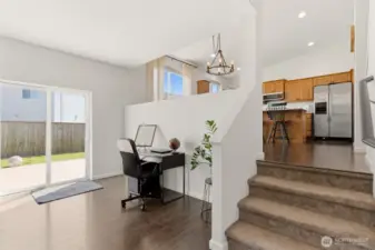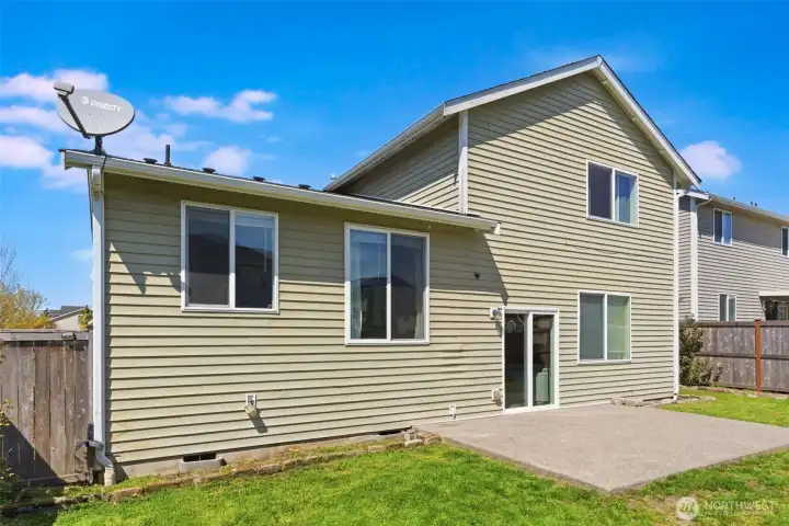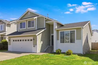 Welcome to this beautifully maintained tri-level offering 2,261 sq ft of open, airy living space in the heart of Yelm. Vaulted ceilings and abundant natural light create a warm, inviting atmosphere throughout the home.The main living area flows seamlessly into the kitchen and overlooks the lower level, creating an inviting flow ideal for daily living and gatherings. The kitchen boasts warm oak cabinetry, a beautiful tile backsplash, stainless steel appliances, pantry, and an island with generous counter space. LVP flooring throughout the main and lower levels adds a clean, durable, and cohesive look.The lower level extends the home with a family room featuring high ceilings, a cozy fireplace with tile surround and mantle, and a slider to the nicely sized, fully fenced backyard with a large patio perfect for gatherings or enjoying the outdoors.One bedroom on the lower level and three upstairs including a spacious 5-piece primary suite offer flexibility and privacy. Freshly painted and cared for with evident pride of ownership, this home is move-in ready.Conveniently located just minutes from schools, shopping, and everyday amenities, and a 25-minute commute to JBLM, this home blends comfort, space, and accessibility in a welcoming setting.