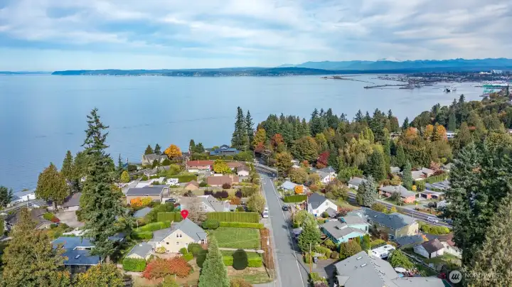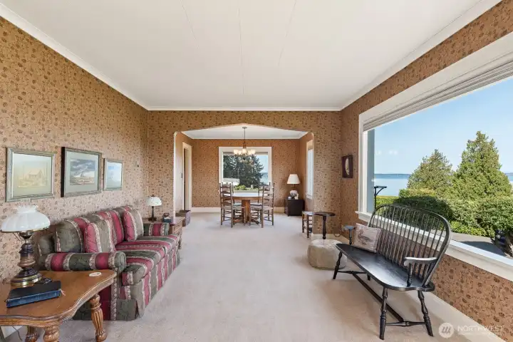 Living Room open to Dining Room both with large windows to capture the gorgeous water & mountain views.