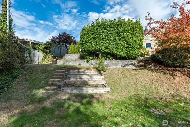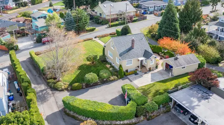 Sprawling lawn with mature landscaping and privacy hedges and water views