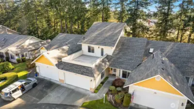 Welcome to one of the largest and most versatile floor plans in the sought-after Palisades at Dash Point—a gated, active 55+ community nestled among the trees of Federal Way. The impressive Great Room showcases vaulted ceilings, skylights, a cozy gas fireplace, and custom built-ins, creating a warm yet refined space filled with natural light. Step onto the private balcony and enjoy peaceful views of the surrounding wooded wetlands—an ideal setting for morning coffee or evening relaxation. Designed for effortless main-level living, the home features a spacious primary suite, laundry, and all essential living areas on the main floor—offering comfort and convenience without the need for stairs. The primary retreat includes a soaking tub and a large walk-in closet, providing a perfect place to unwind. Upstairs, a private junior suite with its own ensuite bath and an expansive rooftop deck above the garage offers an exceptional guest experience. An additional bedroom provides flexibility for a home office, hobby space, or den. The lower level adds even more versatility with a partially finished workshop and craft room—ideal for projects, storage, or creative pursuits. Major updates offer peace of mind, including a new roof (2025) and a high-efficiency heat pump (2023) providing year-round heating, cooling, and air filtration. A rare opportunity to enjoy space, comfort, and a tranquil setting—this home truly has it all.