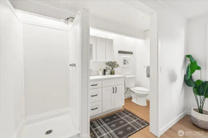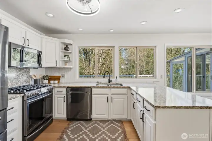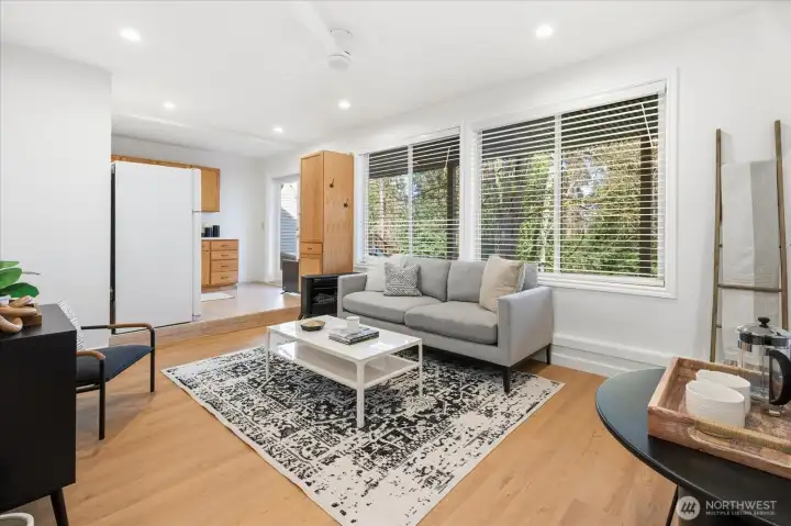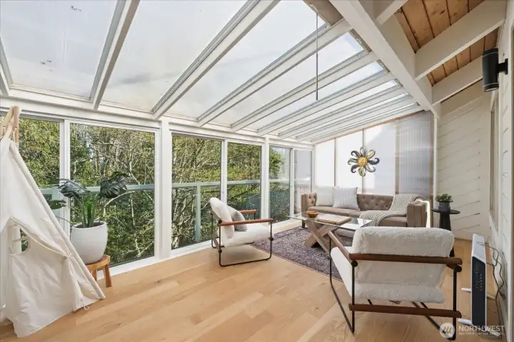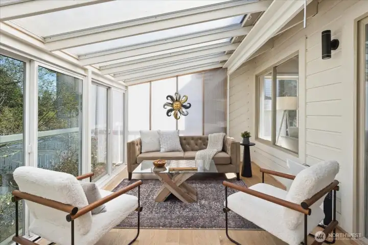 Welcome to Lake Forest Park. This sun-filled, fully updated four-story home offers an exceptional blend of light, space, and versatility. South-facing decks and a stunning upper-level sunroom invite natural light to pour into the home, while soaring ceilings, skylights, and expansive living areas create a bright, open, and inviting atmosphere throughout. A thoughtful reimagining of a classic design, the home offers a flexible layout with excellent potential for multigenerational living, guest accommodations, hobbies, or lower-level income opportunities. The upper-level sunroom provides a peaceful space to relax, while the distinctive primary suite, vaulted ceilings on the main level, and generous room sizes set this home apart. A dedicated workshop or craft room with its own bath adds even more functionality. Each level opens to a spacious deck, creating a seamless connection to the outdoors. Recent updates include oak hardwood floors and over $450,000 in improvements, A New roof, interior and exterior paint, siding and a concrete driveway. Do not let the modest street presence mislead you. This home lives much larger than it appears and is best experienced in person. Ideally located near neighborhood favorites, schools, and daily amenities, Bike the Burke-Gilman Trail with easy access to Redmond and Seattle. Lake Washington, parks, and local gathering spots are all nearby. A remarkable transformation of a classic home, this residence truly feels better than new.