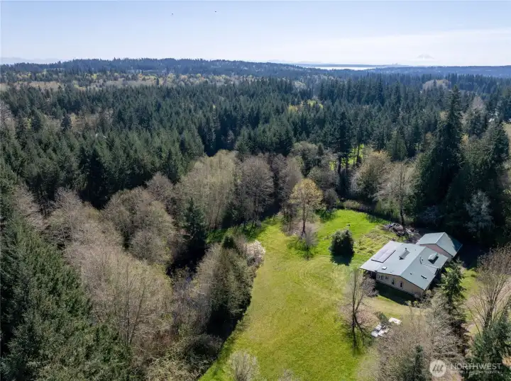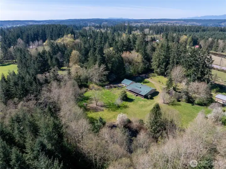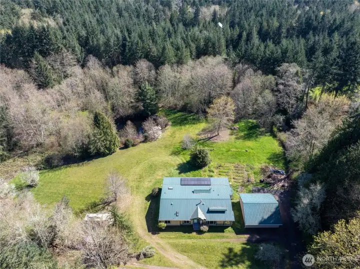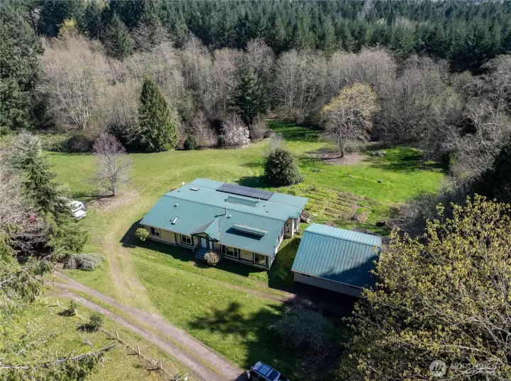 Private Northwest Retreat with Pond, Shop-Style Garage & Contractor-Friendly Acreage. Discover the perfect blend of country privacy and Pacific Northwest lifestyle on this beautifully situated 3-bedroom, 2-bath home set on 2.5 secluded acres. Thoughtfully designed for both relaxation and productivity, this property offers rare features that are increasingly hard to find. At the heart of the land is a private pond, easily stocked for fishing, creating a peaceful backdrop for daily living or weekend enjoyment. A large southern-exposure garden area provides excellent sun for growing vegetables, flowers, or fruit, ideal for gardeners and homesteading enthusiasts. The home includes a 900 sq ft heated garage, warmed by an efficient propane heater—perfect for a workshop, hobby space, or secure equipment storage. Solar panels help offset energy costs, adding long-term efficiency and value. Step outside to the large covered porch, an ideal spot for summer entertaining or unwinding at the end of the day. An older barn-style structure at the back of the property offers additional storage or future project potential. The expansive lot easily accommodates RV, boat, or contractor vehicle parking, with plenty of room to run a contractor or home-based business, including space for work trucks and equipment. All of this is located just minutes from the Puget Sound, offering quick access when the salmon are running, along with nearby recreation and coastal charm.